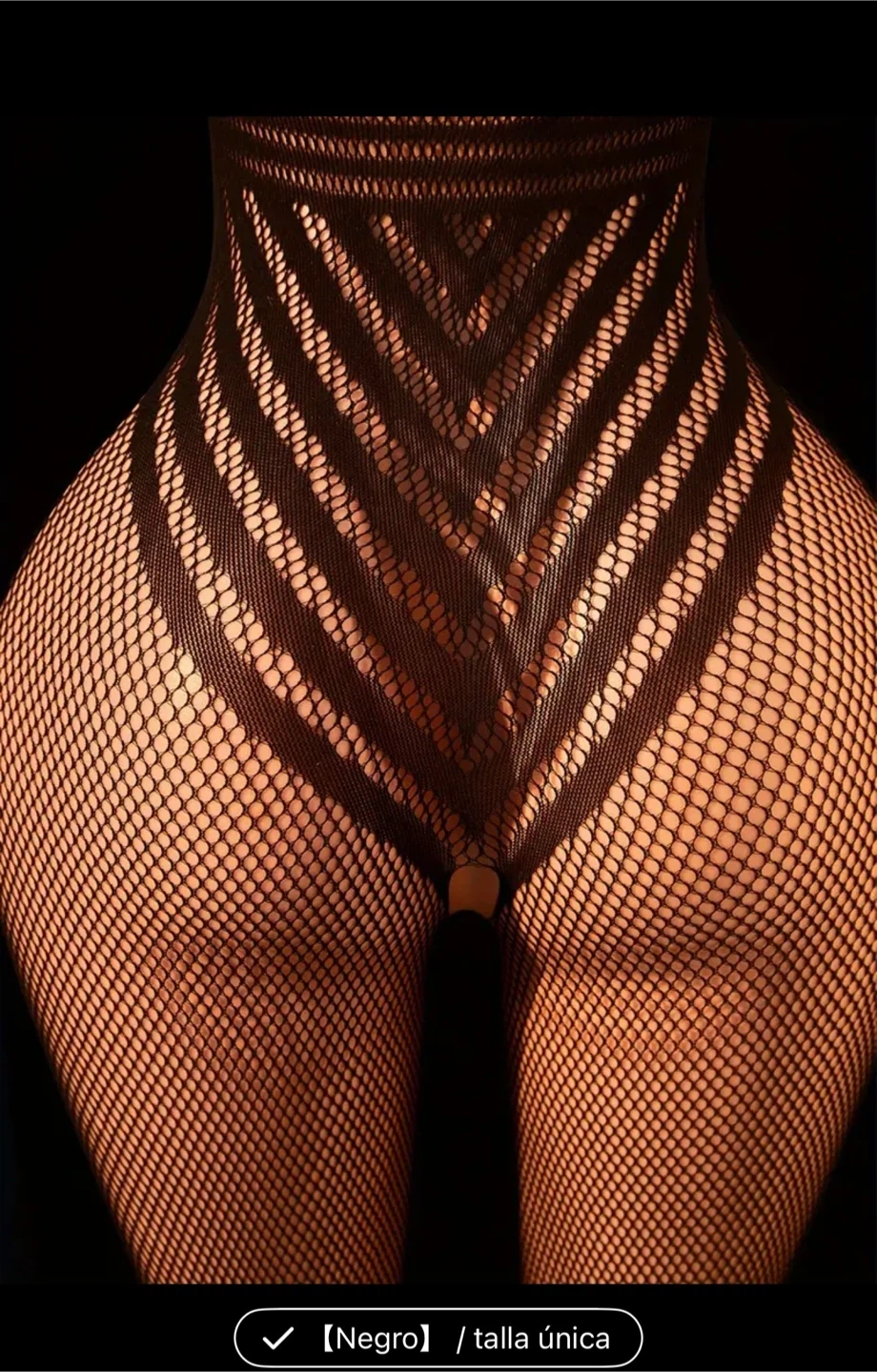 Fishnet halter bodysuit in black. Features a unique chevron stripe pattern on the torso. One size fits most.