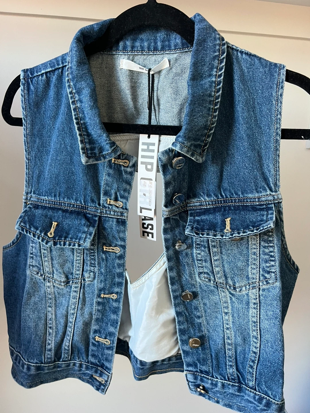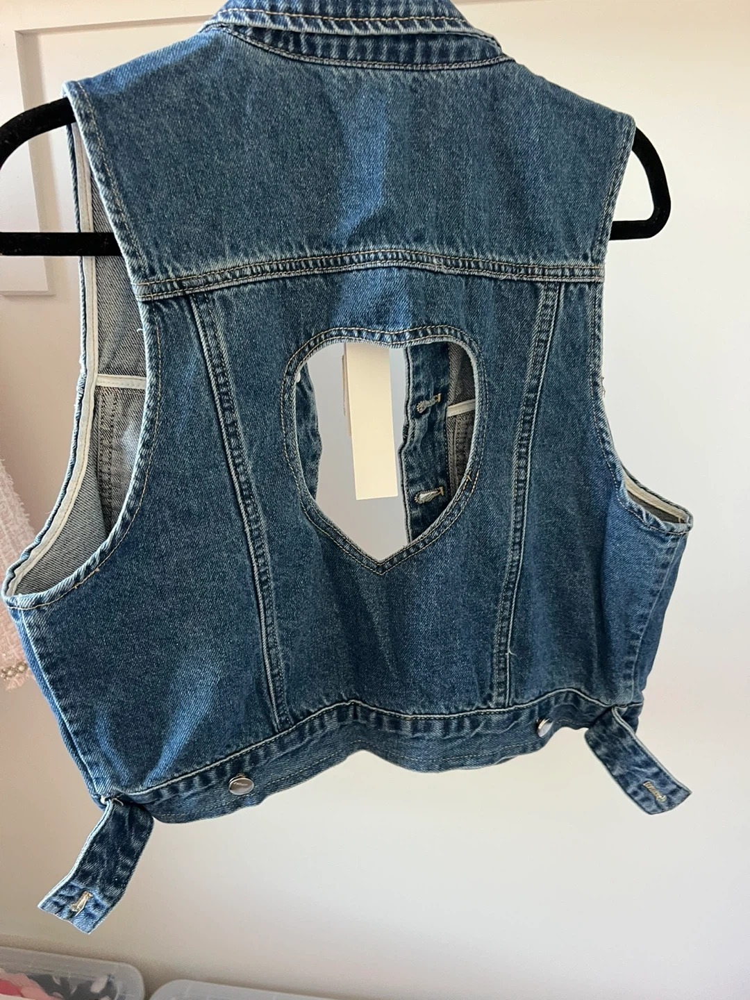 83This Hip gilr denim vest is in great condition and features a unique heart-shaped cutout on the back. It's a size medium and made of durable denim material. Perfect for adding a stylish touch to any outfit!