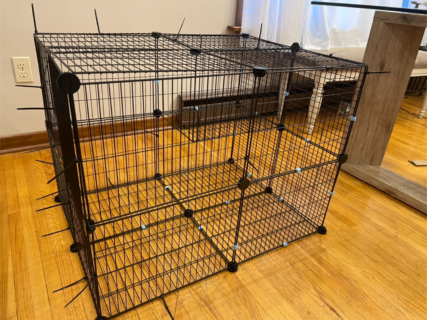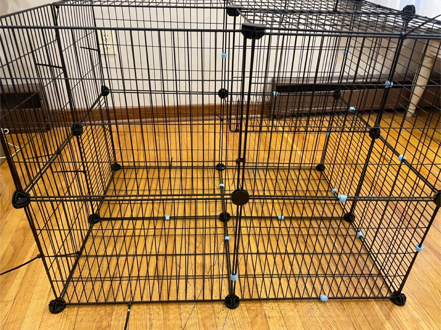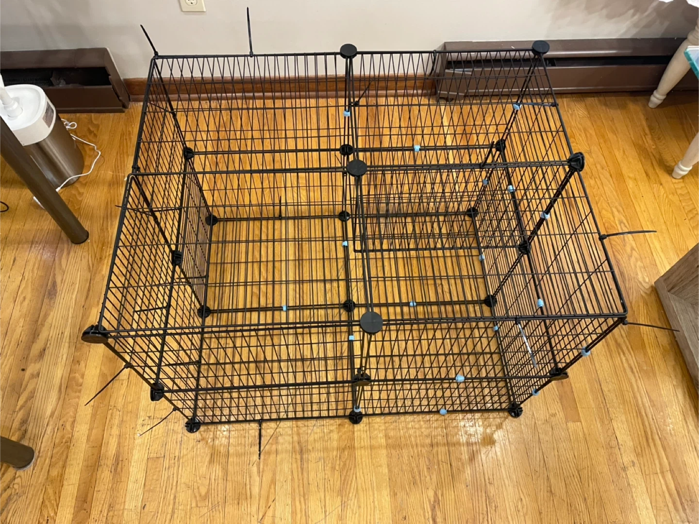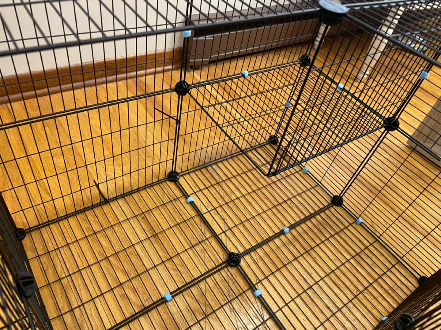 This is a black wire pet playpen. It's constructed with metal wire panels and plastic connectors. The panels are modular and can be reconfigured to create different shapes and sizes. It's suitable for small to medium pets.
