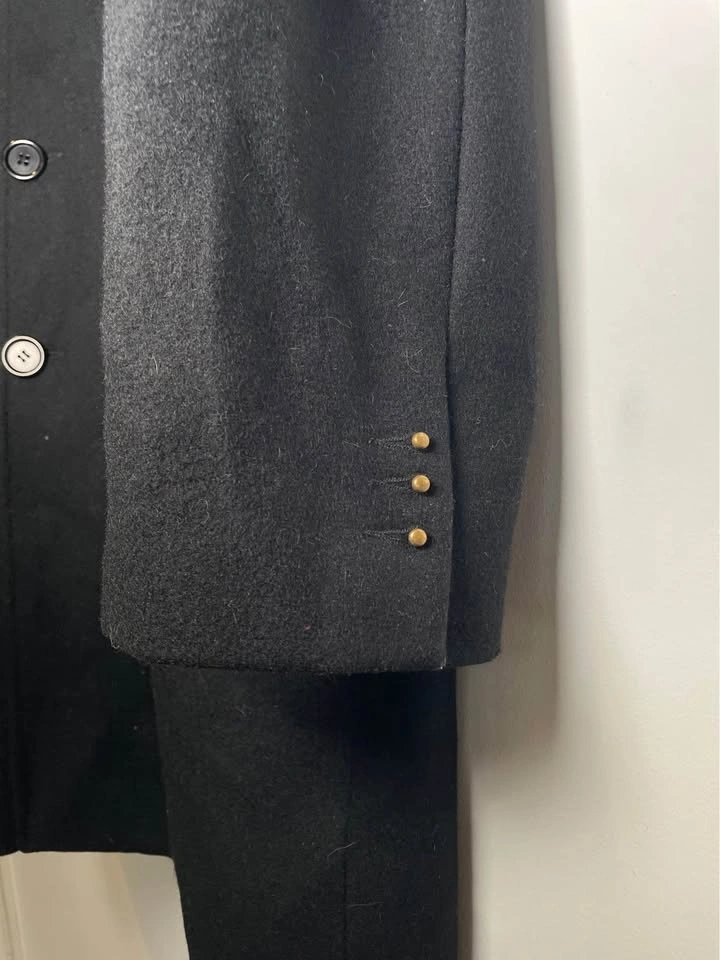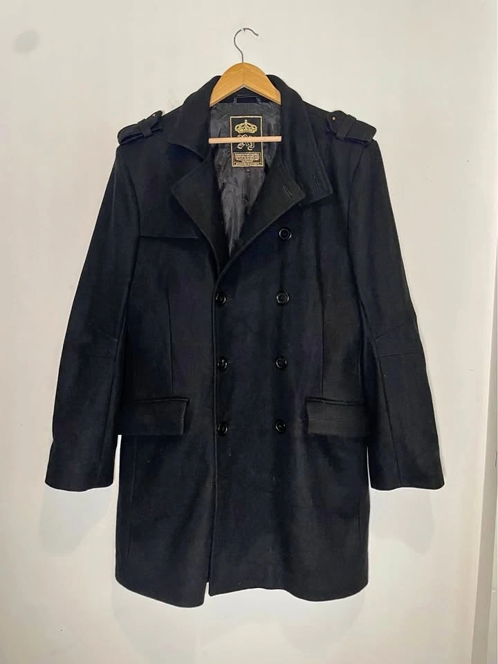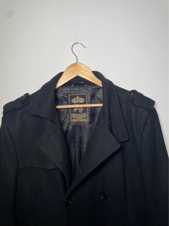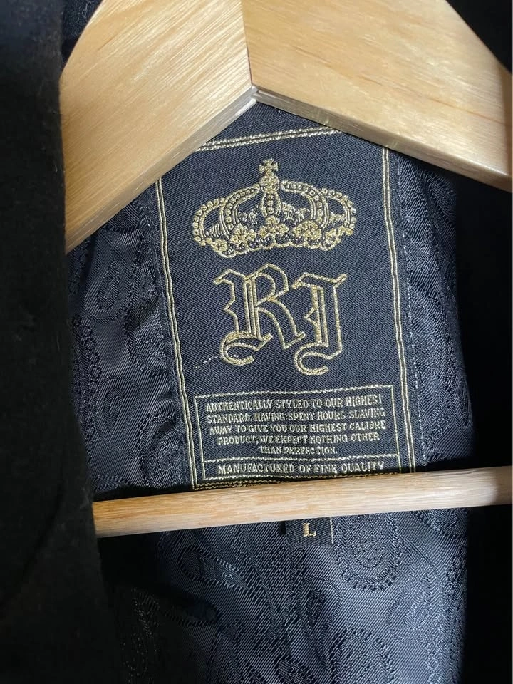 Selling a sharp RJ wool-blend coat in excellent condition. This is a heavy, structured piece with a great "rock-inspired" military aesthetic. Features a double-breasted front with crested metallic buttons and shoulder epaulettes. The interior has a signature charcoal paisley lining. Like new, no pilling or wear on the wool. Perfect for a dressed-up look that still has some edge. Pickup in Toronto.