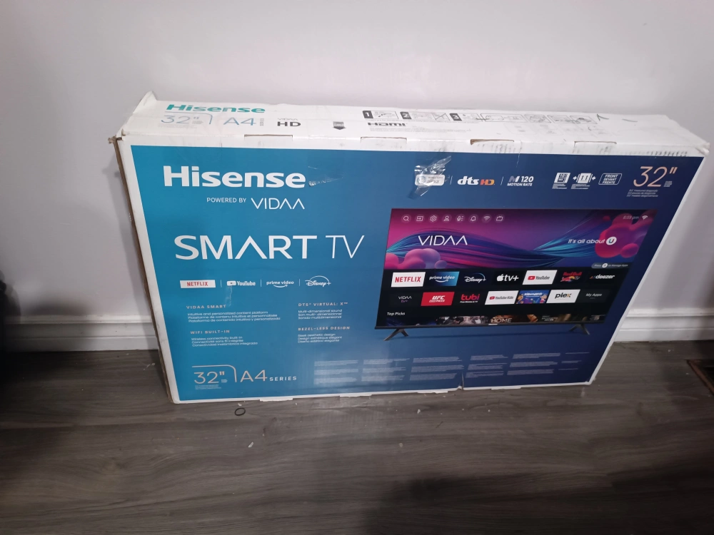 732 inch Smart TV. New in box. A4 series. Powered by Vidaa. Features Netflix, YouTube, Prime Video and more. DTS Virtual: X. Bezel-less design.