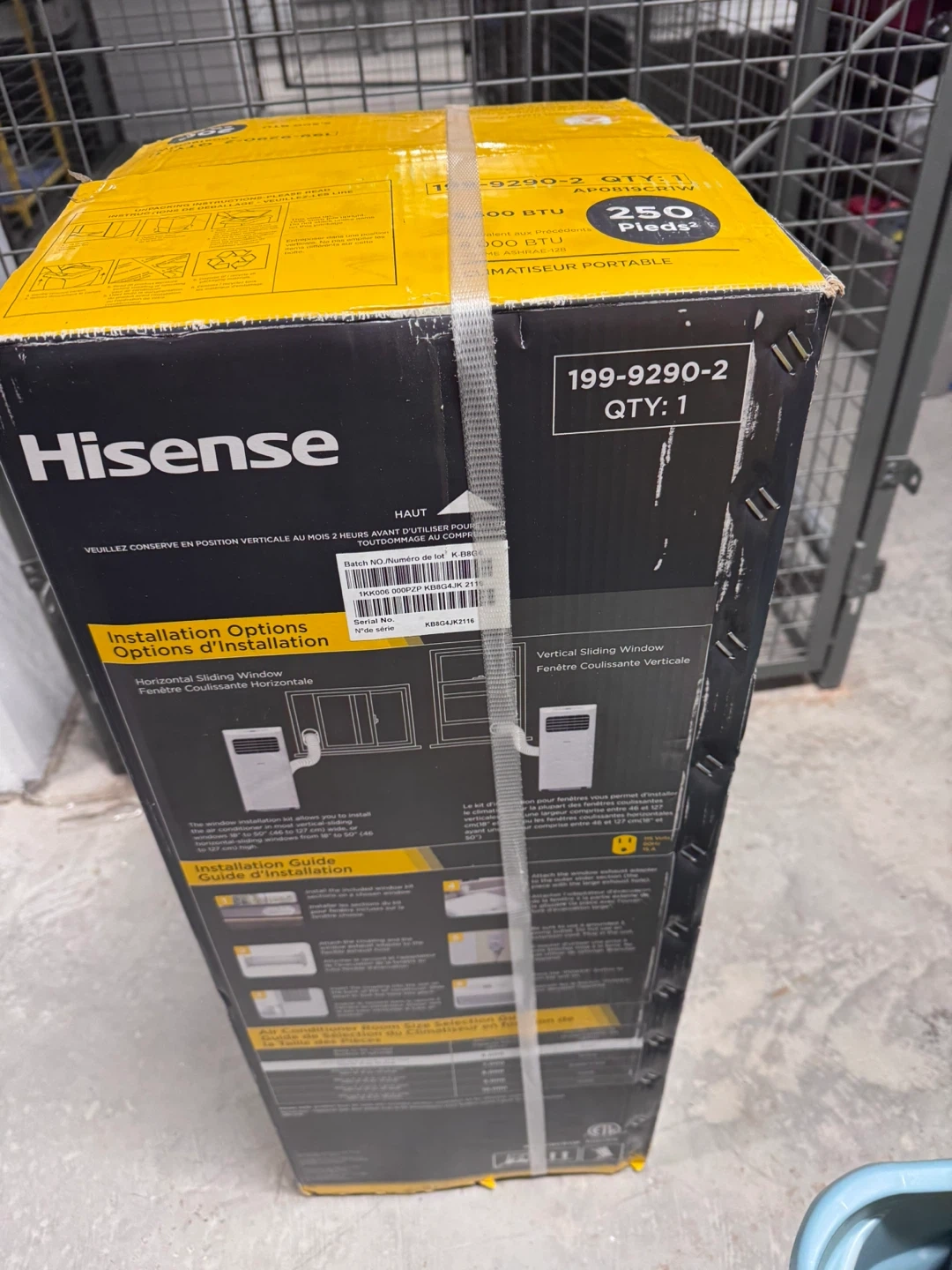 65Selling a Hisense portable air conditioner. It's 5,500 BTU and can cool up to 250 square feet. The box includes installation guide and options for horizontal or vertical sliding windows. It has 3 modes and is compact in size