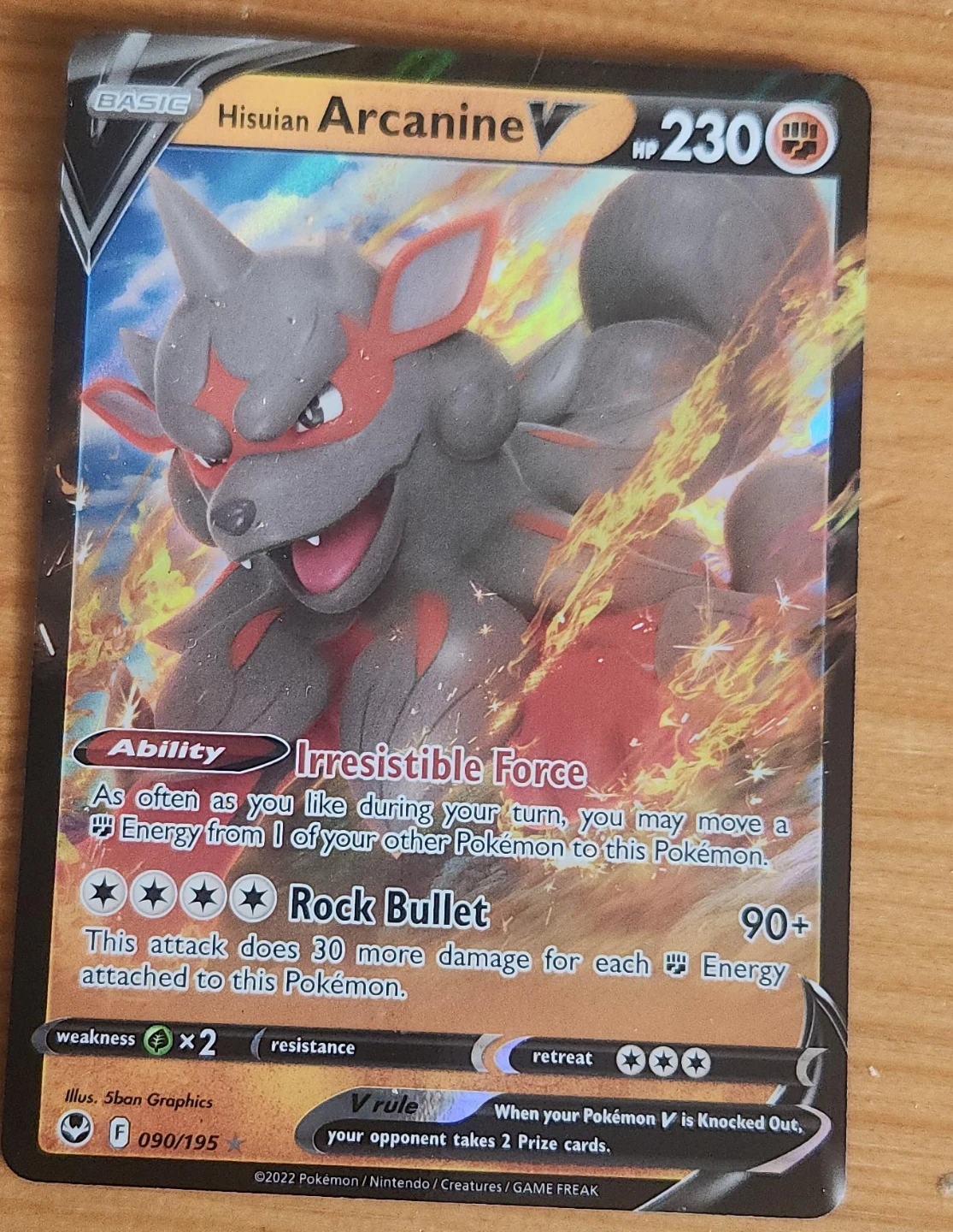 10Selling a Hisuian Arcanine V Pokemon card! It has the ability Irresistible Force and the attack Rock Bullet. It also has weakness x2 and resistance. A great card for any collector!