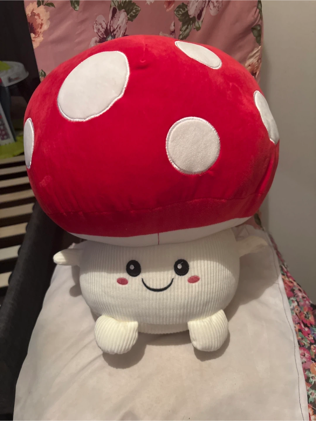 Super cute and squishy mushroom plushie! It's got a corduroy texture on its body and arms, with a bright red cap adorned with white polka dots. This adorable stuffed toy is perfect for adding a touch of whimsy to any room. It’s really big.