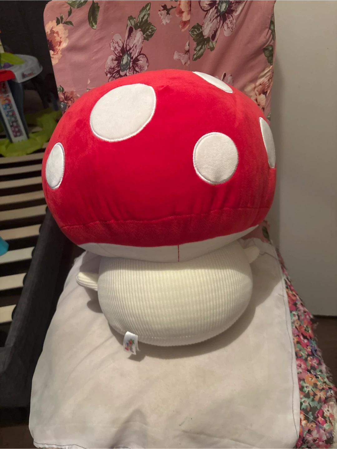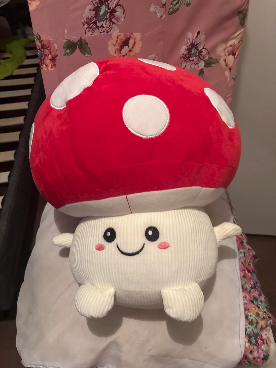 Super cute and squishy mushroom plushie! It's got a corduroy texture on its body and arms, with a bright red cap adorned with white polka dots. This adorable stuffed toy is perfect for adding a touch of whimsy to any room. It’s really big.