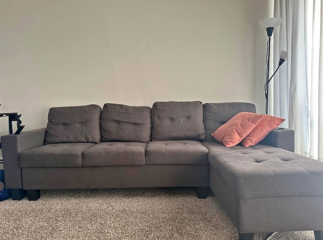 Selling a comfy grey sectional sofa that comes with an ottoman! It's in great shape and perfect for a living room or den. The ottoman provides extra seating or a place to kick up your feet after a long day. Pillows not included