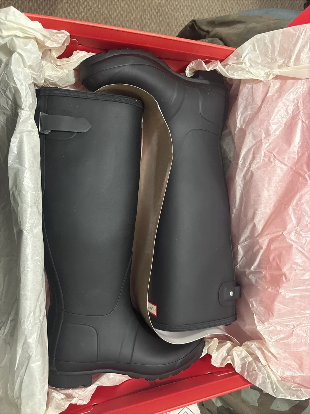 Selling a pair of Hunter Women's ORG Back Adjustable rain boots in black, size US 8. These are in great condition and come with the original box!