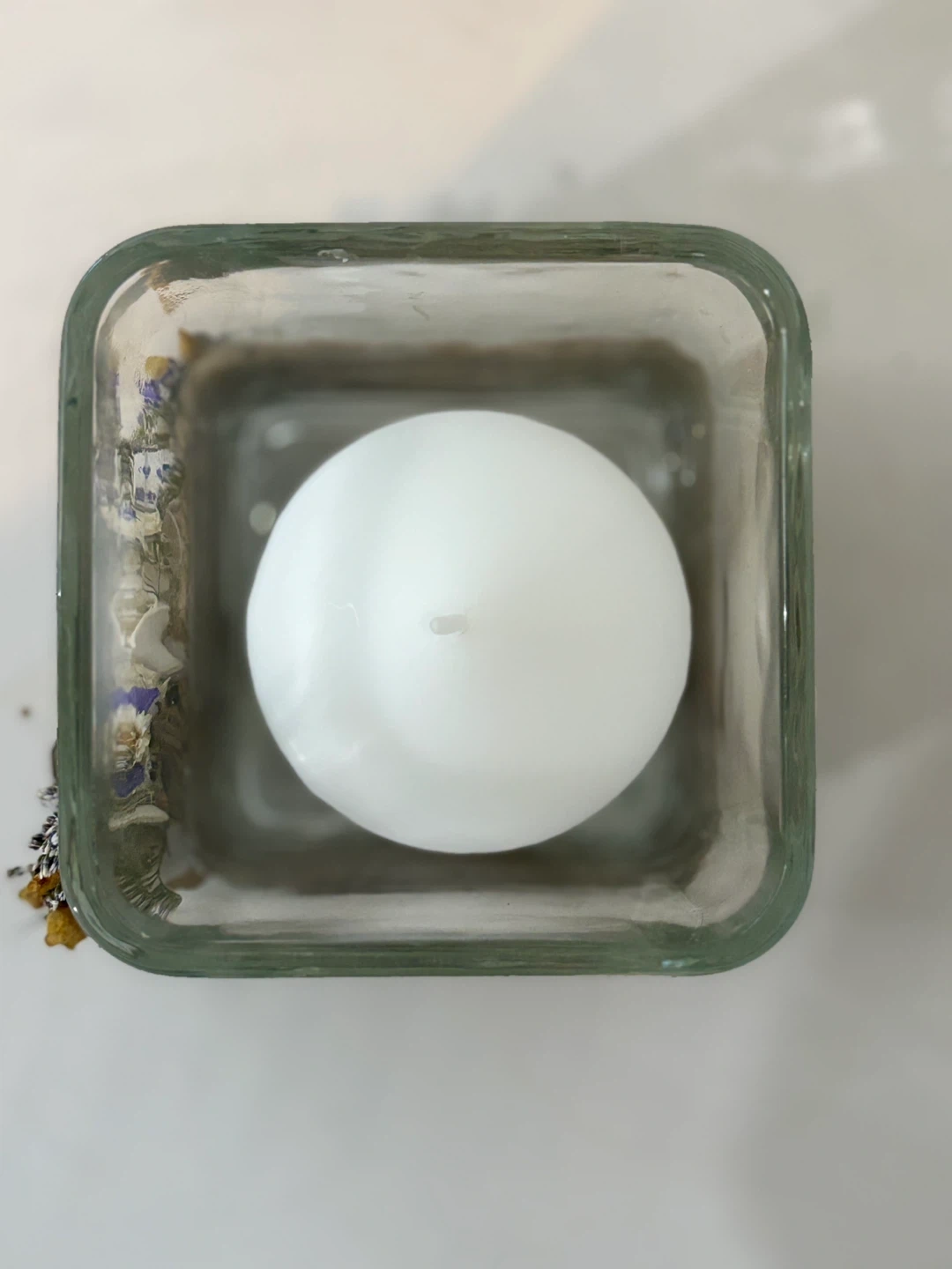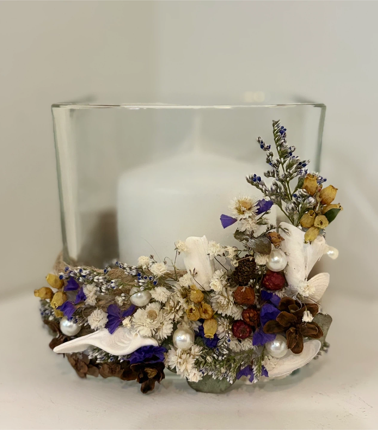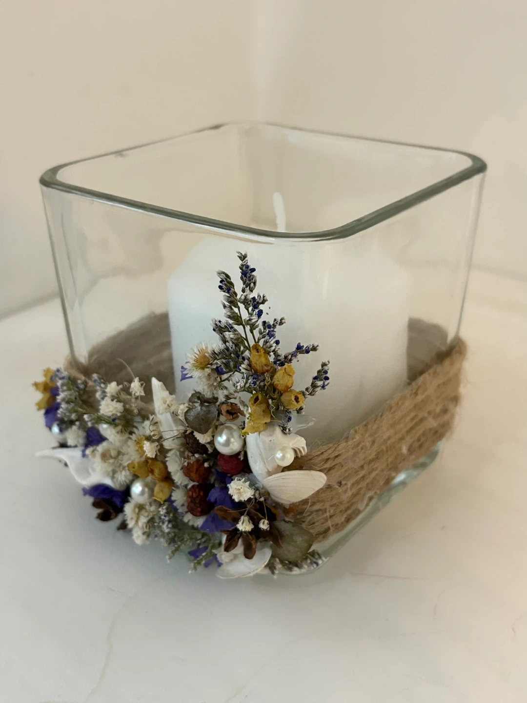 This is a clear glass candle holder with a white pillar candle inside. It's decorated with a beautiful arrangement of dried flowers, small shells, and pearls tied with twine around the base. The glass is square-shaped. It's great for adding a rustic or coastal touch to any room!❣️1331 Georgia West ❣️
