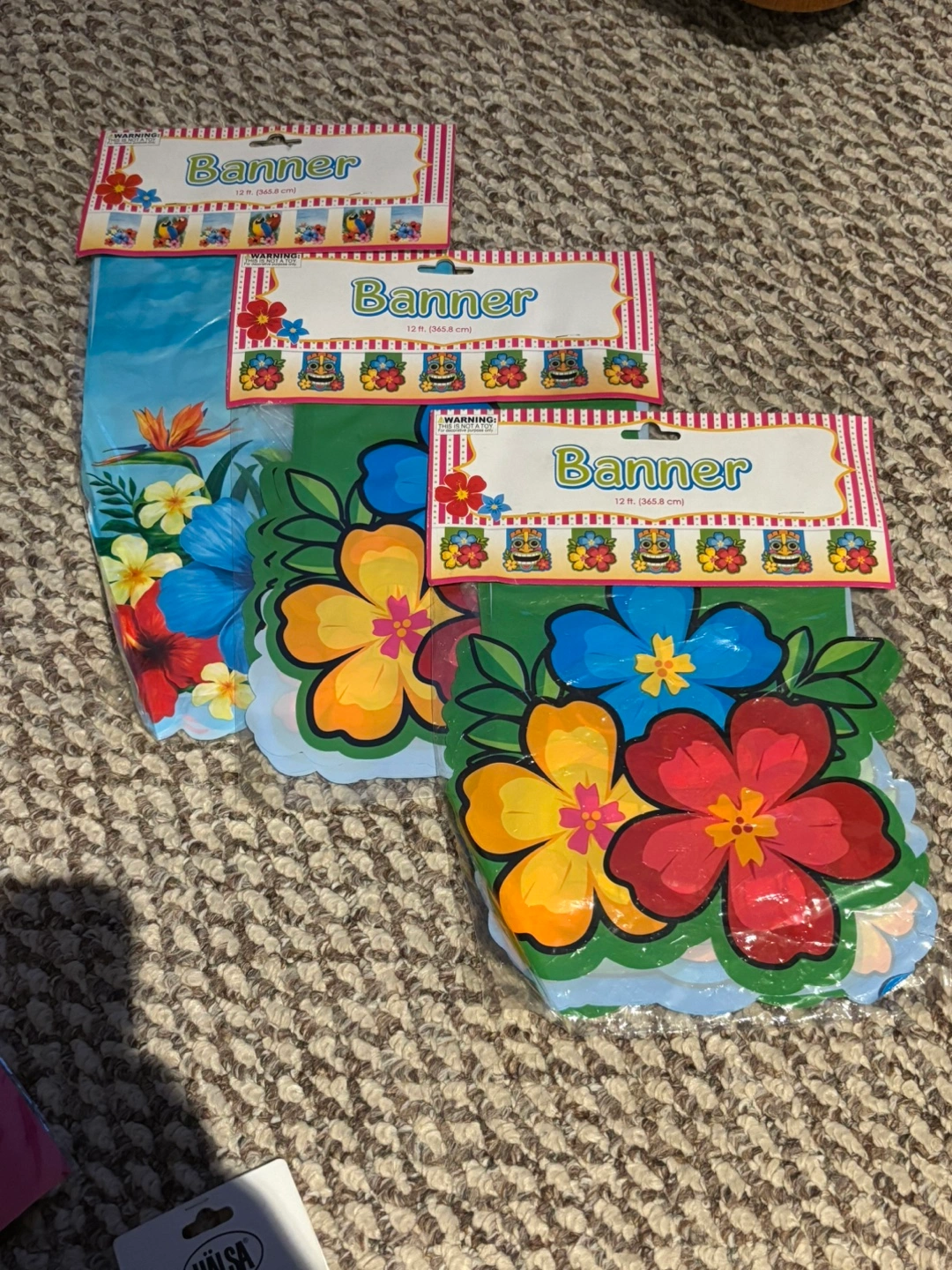 Three decorative banners. One banner features a blue backdrop with a floral design. Two banners display colourful flowers. Perfect for a party to create a festive atmosphere.