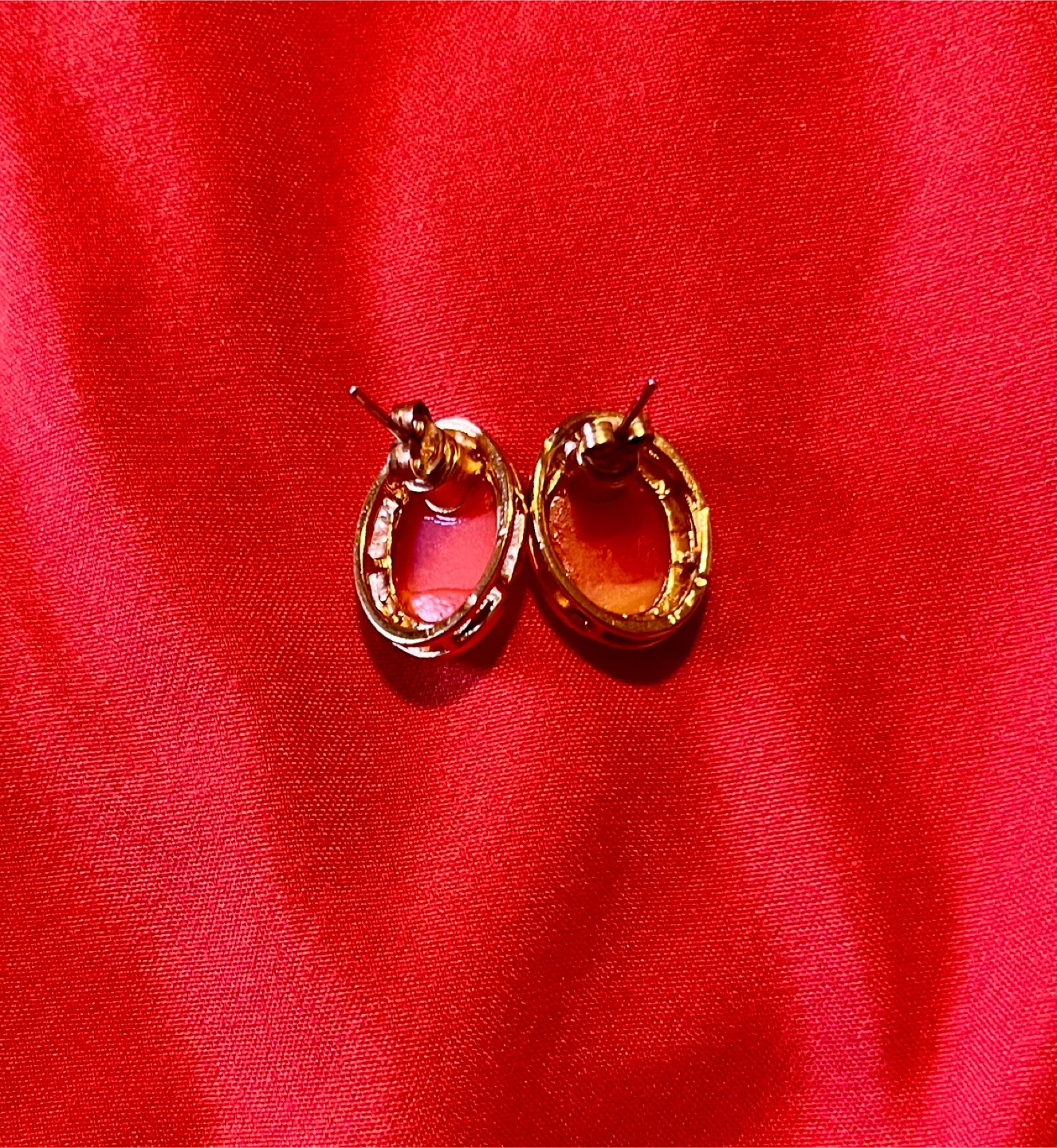 These are a pair of vintage cameo earrings. They feature an oval-shaped cameo with a profile of a woman. The setting is gold-toned metal.