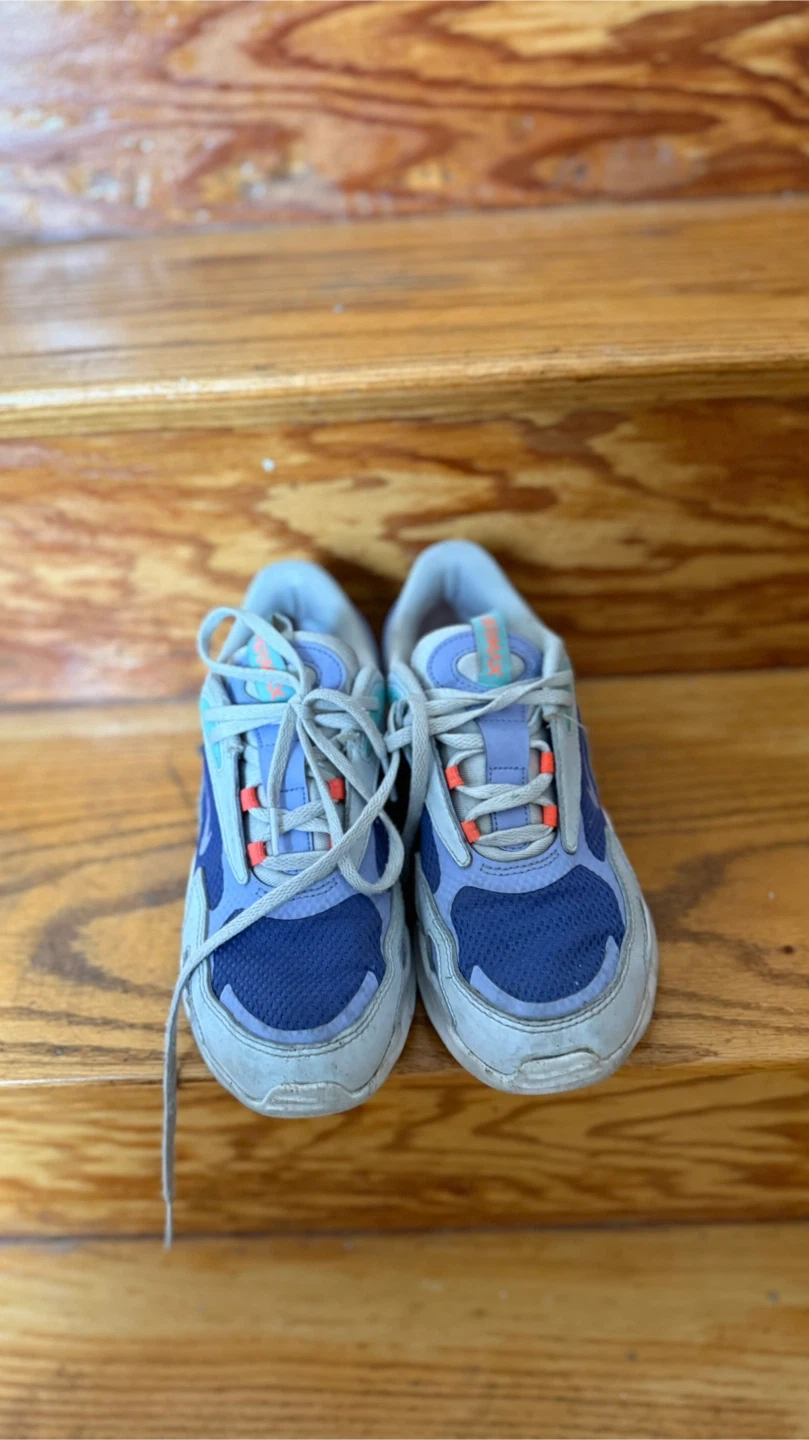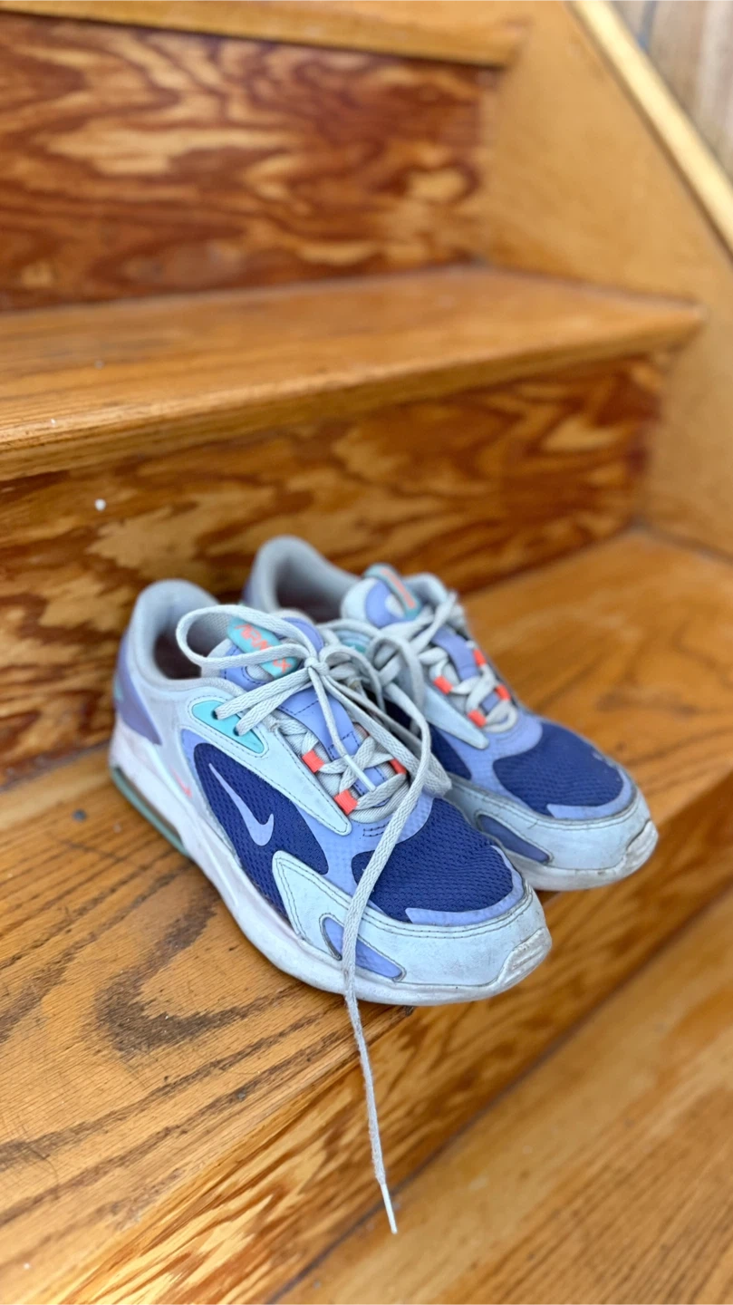These Nike running shoes are primarily purple and blue with orange accents. They're made with a mesh and synthetic upper. These shoes would be great for hitting the track or for casual wear.