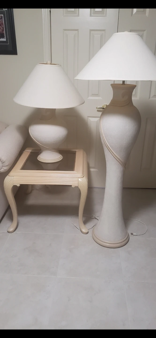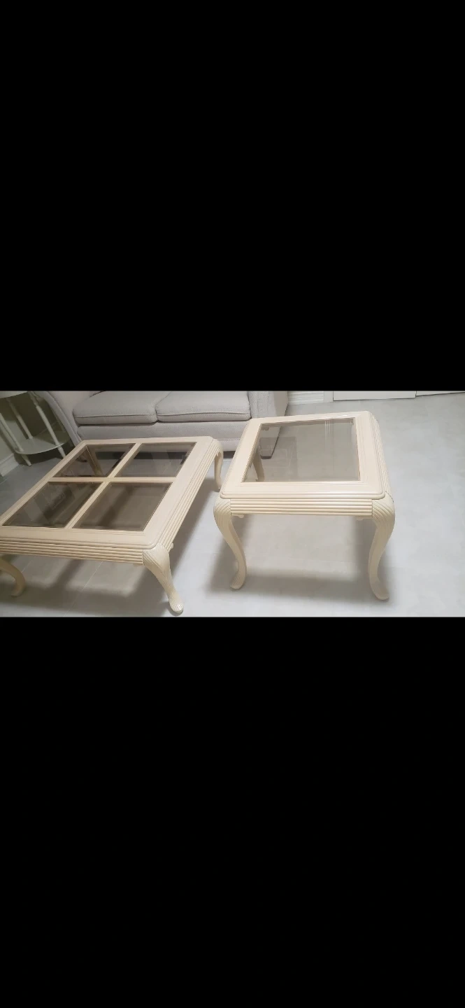 Stylish cream coloured side table and coffee table set. Both tables have glass tops and carved detailing. 2 Lamps as well. They'd be great for a living room setup! Message for pricing.