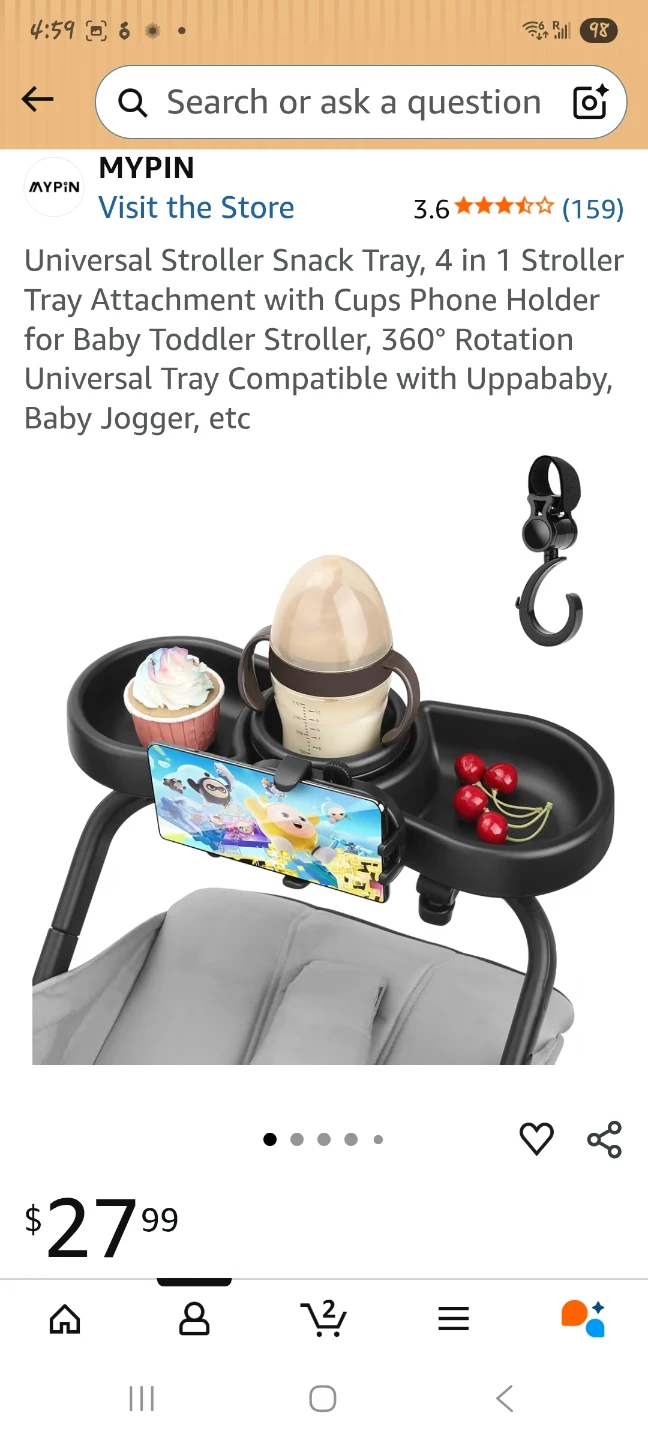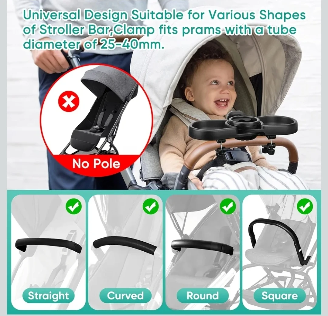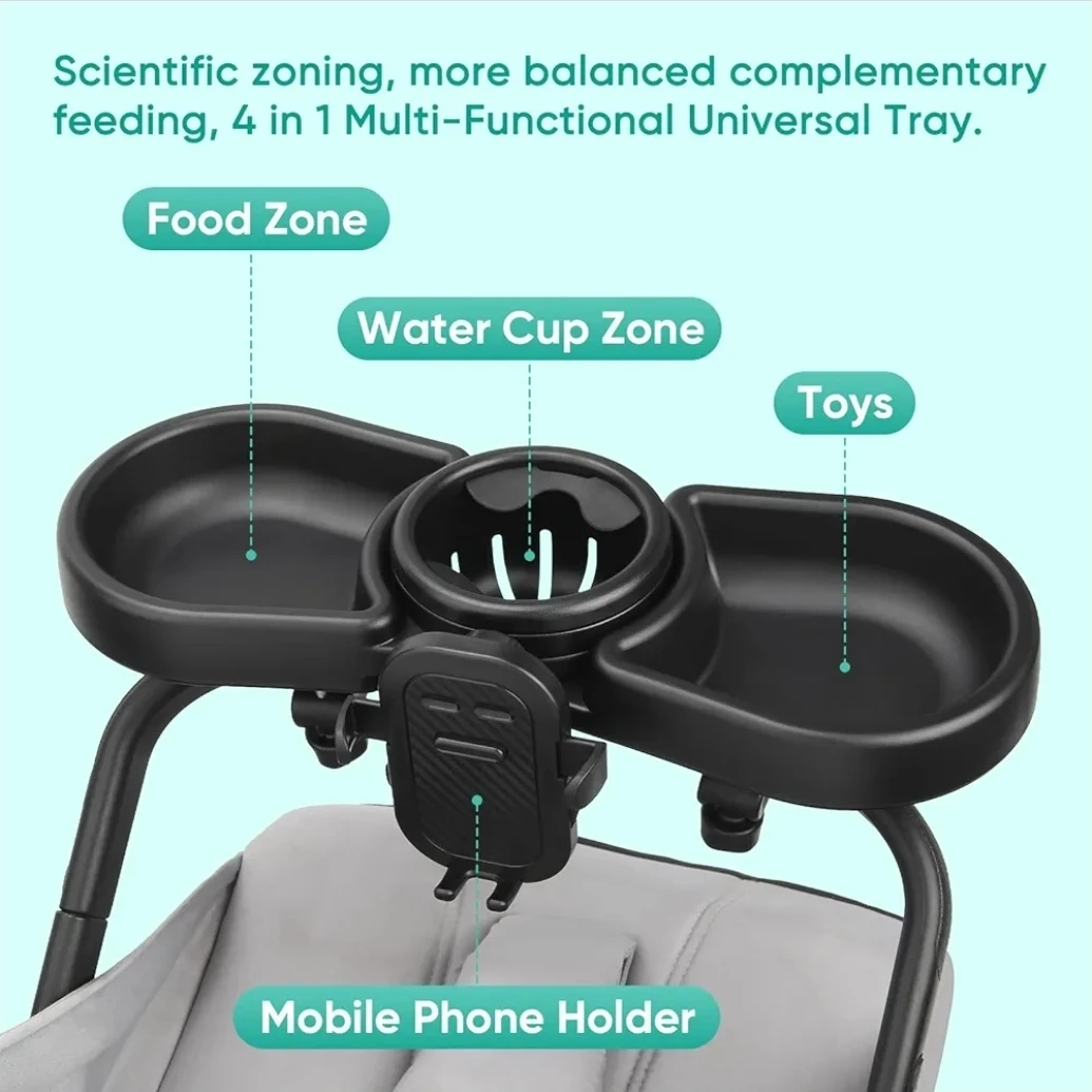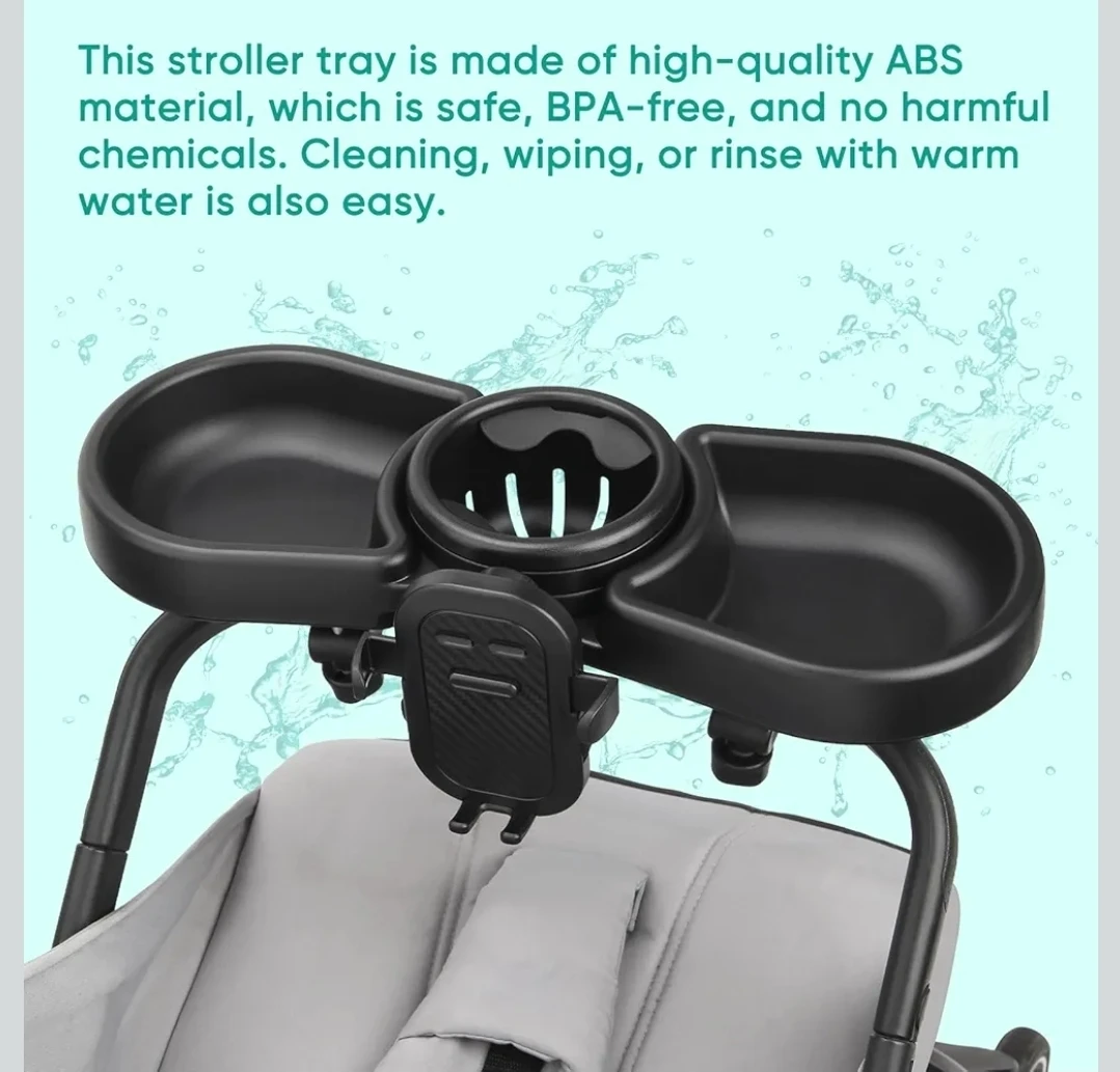 This is a 4-in-1 universal stroller snack tray with food, water cup, toy zones and a mobile phone holder. It's made from high-quality ABS material, BPA-free, and easy to clean. The tray offers convenient storage for snacks and drinks while on the go.