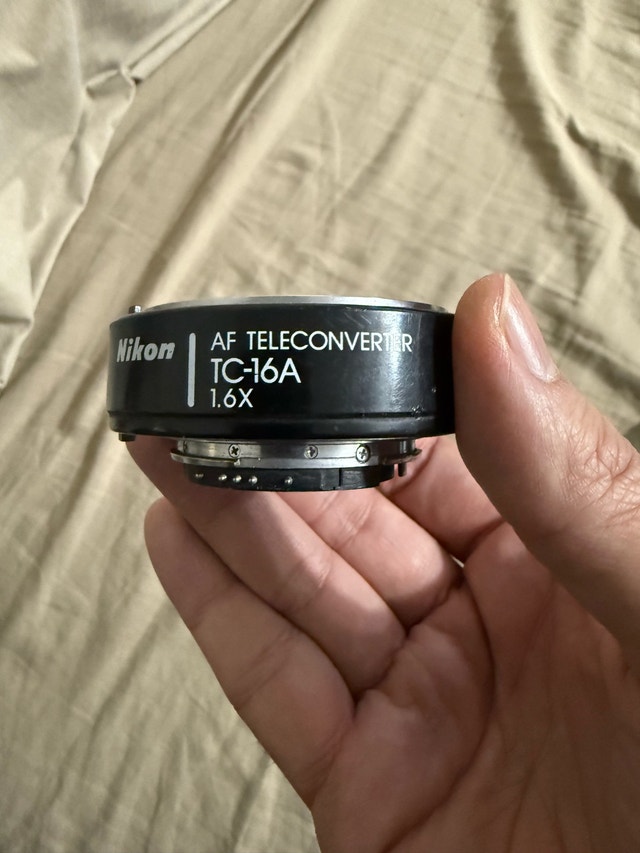 Nikon TC-16A 1.6× AF teleconverter. Classic Nikon accessory—popular with collectors and also used by some shooters to extend focal length. Important: Compatibility varies depending on camera/lens combo (older accessory). Please confirm it suits your setup—happy to let you test if you bring your camera/lens.