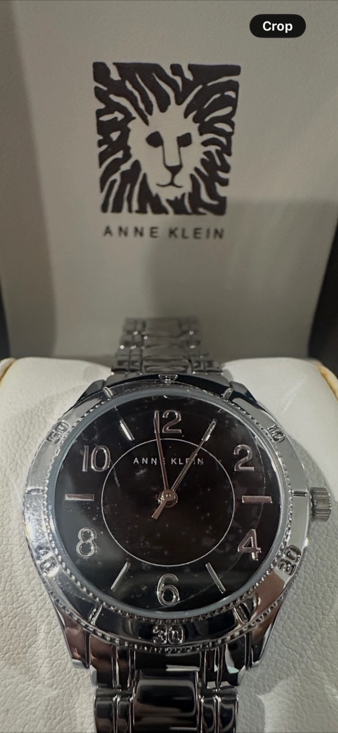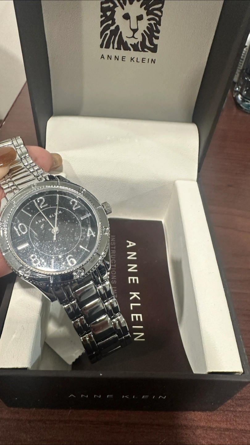 Selling a brand new Anne Klein silver watch! It comes with its original box. The watch has a silver band and a dark face with easy-to-read numbers. It's in great condition and ready for a new wrist!