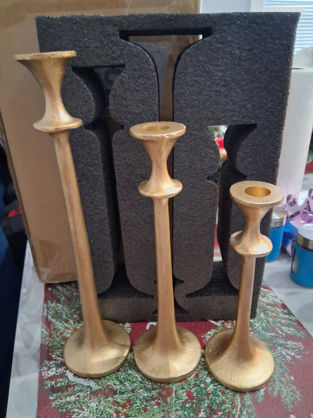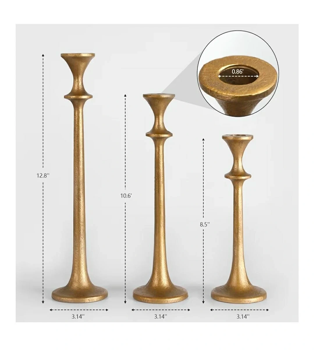 Selling a set of three gold metal candlestick holders! They come in varying heights: 12.8", 10.6", and 8.5". The base diameter is 3.14", and the top opening is 0.86". They come in their original box!