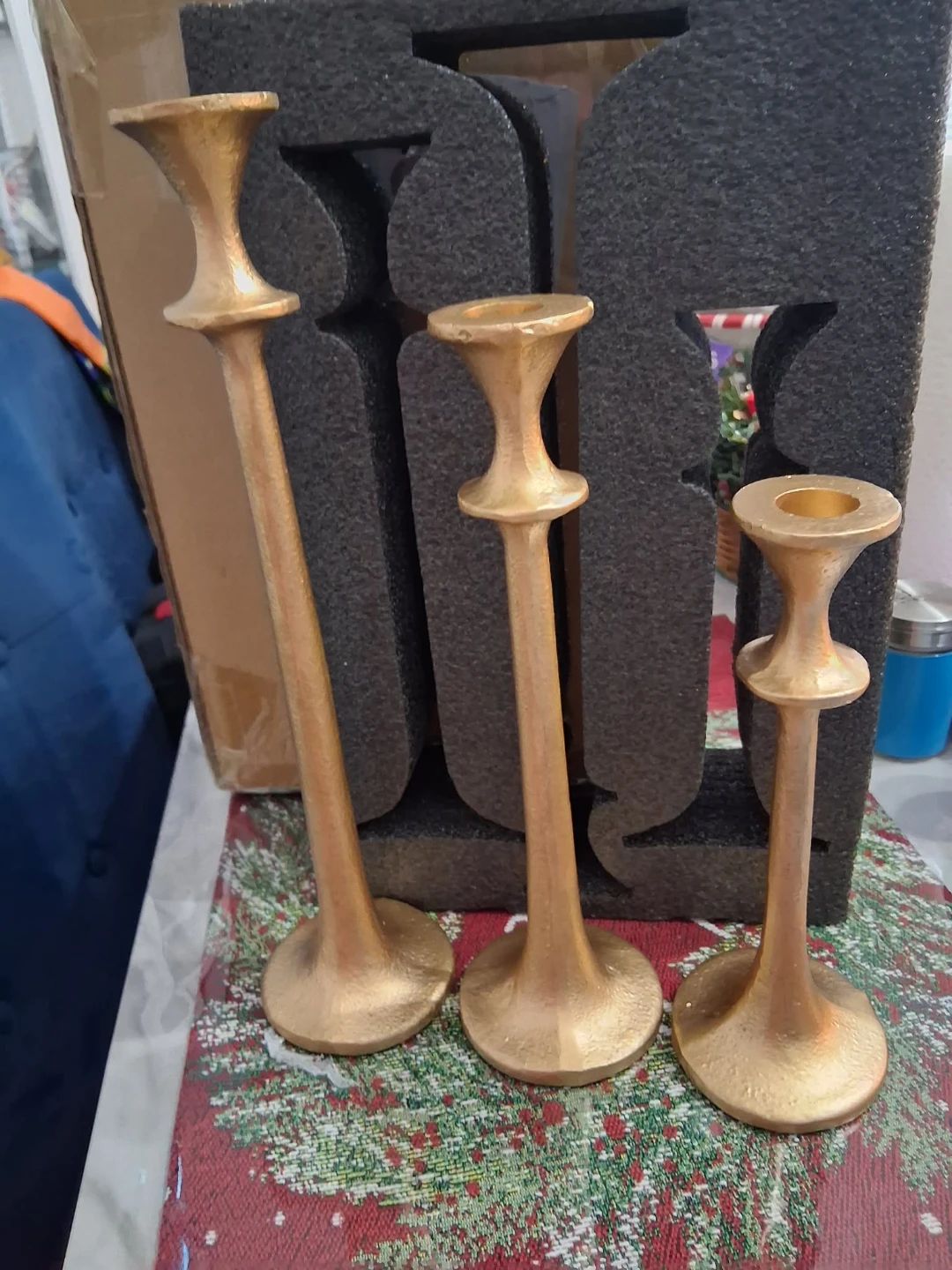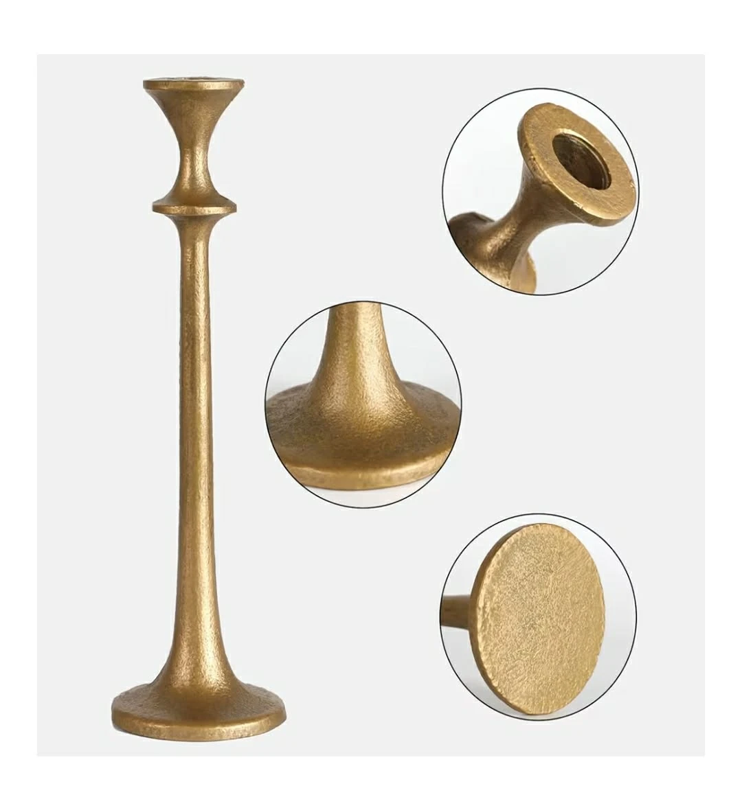 Selling a set of three gold metal candlestick holders! They come in varying heights: 12.8", 10.6", and 8.5". The base diameter is 3.14", and the top opening is 0.86". They come in their original box!