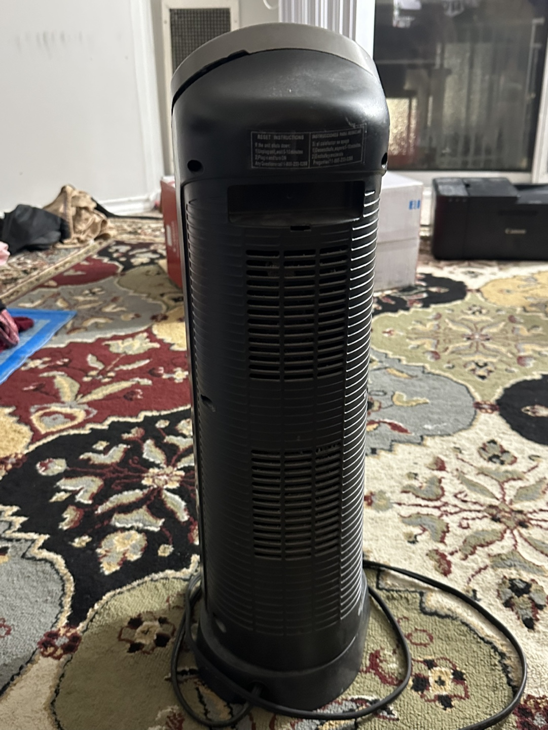 Used Lasko ceramic tower heater. Features multiple heat settings and an adjustable thermostat. Good for small spaces. Minor cosmetic wear.