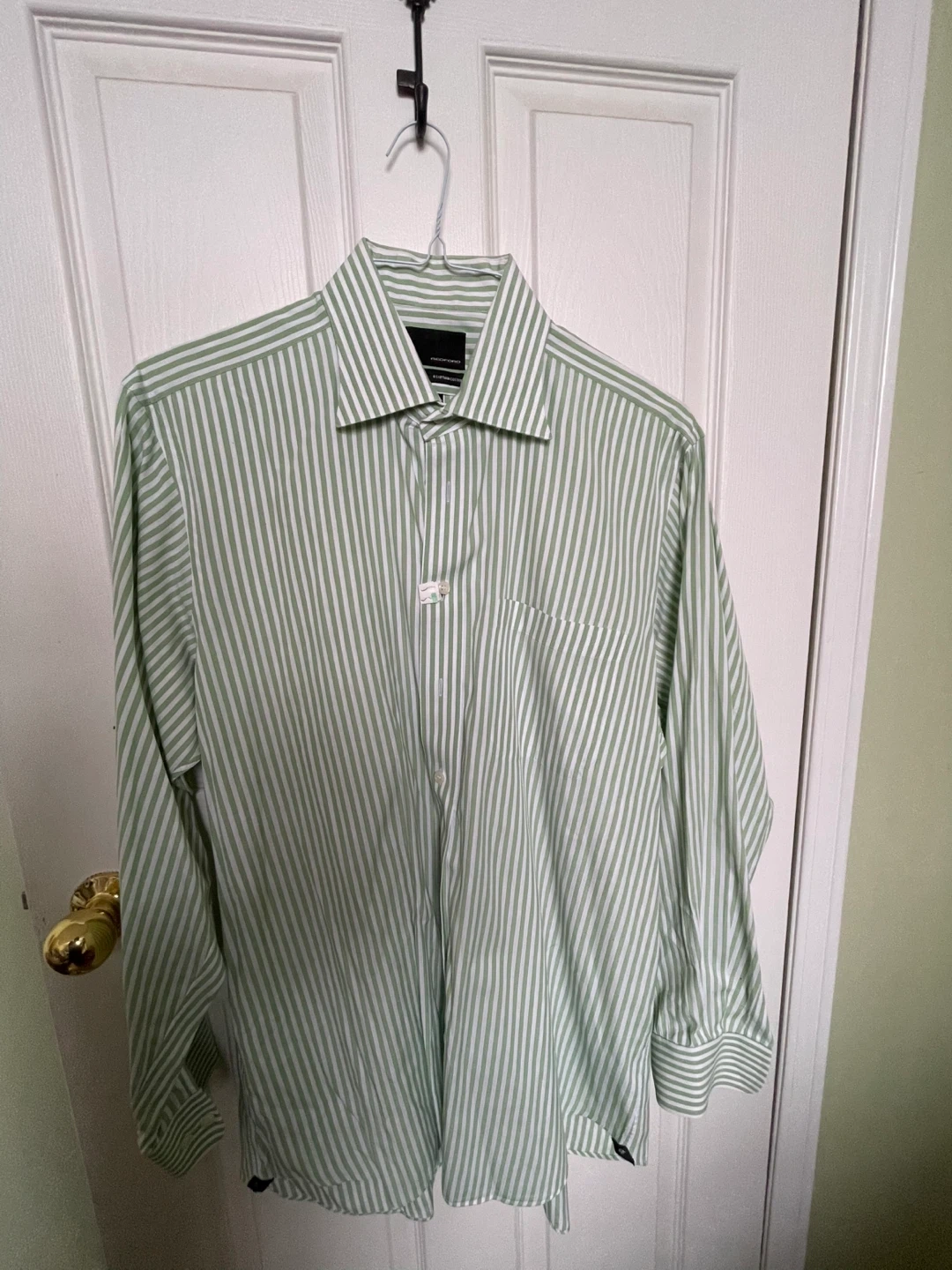 Redford dress shirt in Egyptian cotton. It's a size L with a green and white stripe pattern. This collared shirt is suitable for business or casual wear.