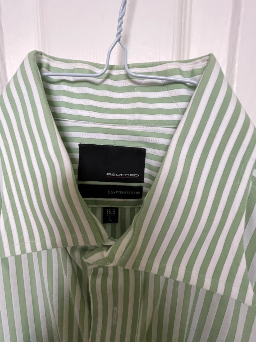 Redford dress shirt in Egyptian cotton. It's a size L with a green and white stripe pattern. This collared shirt is suitable for business or casual wear.