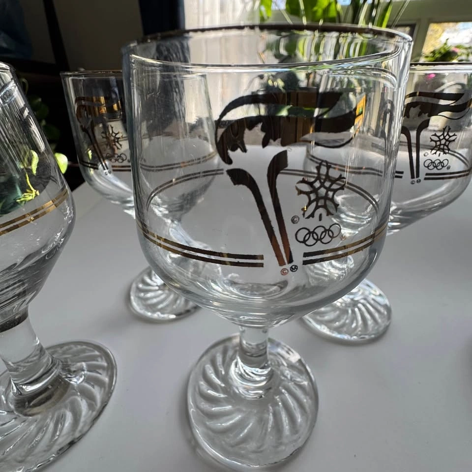 Vintage 1988 Set Of 4 Calgary Winter Olympics Torch relay Gold Trimmed 8 Oz Goblets. Very good condition overall with clean and clear glass. Some fading on the gold rimes (see pictures). Each glass measures 5 7/8" tall and 3" in diameter.