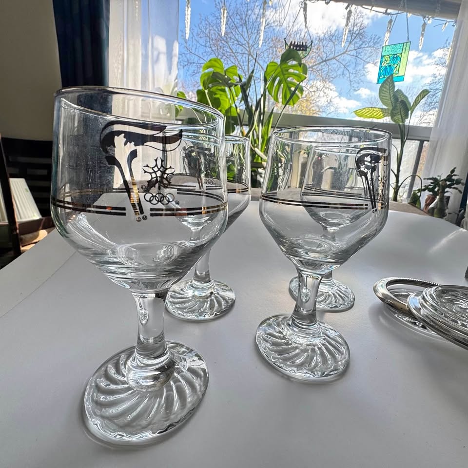 Vintage 1988 Set Of 4 Calgary Winter Olympics Torch relay Gold Trimmed 8 Oz Goblets. Very good condition overall with clean and clear glass. Some fading on the gold rimes (see pictures). Each glass measures 5 7/8" tall and 3" in diameter.