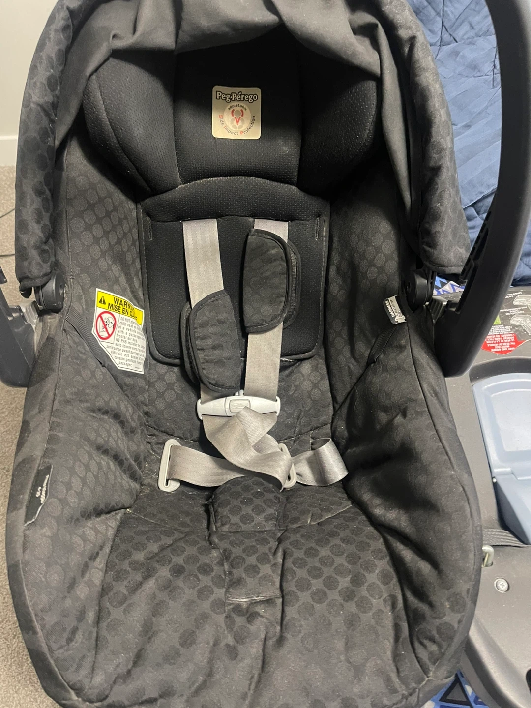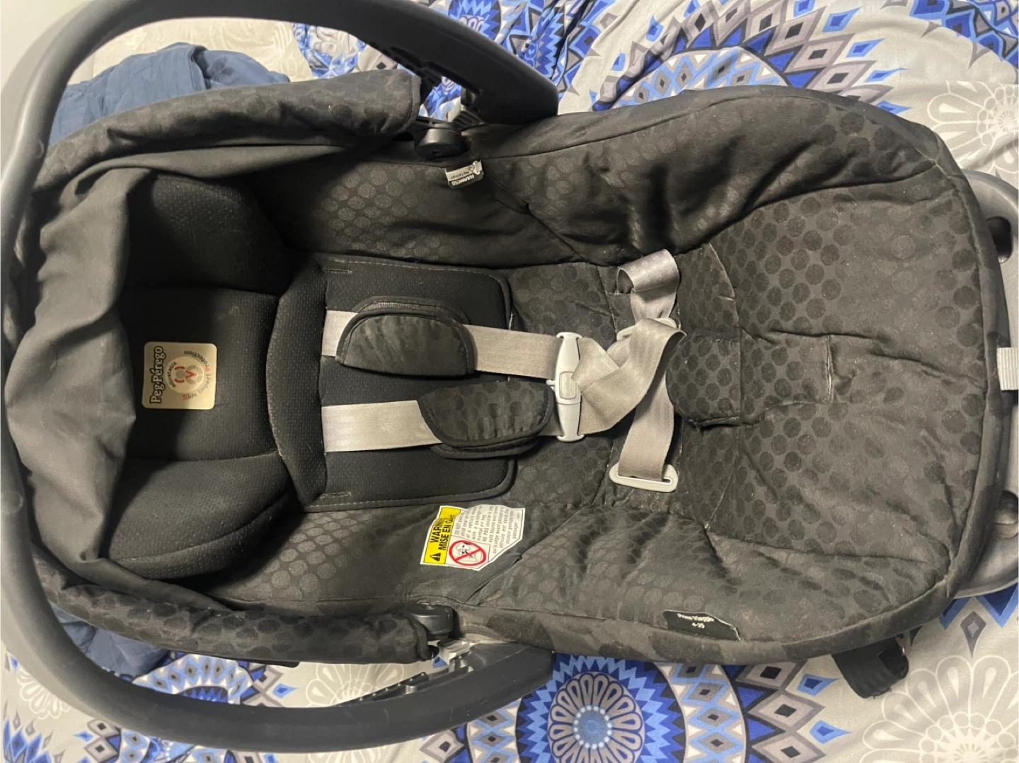Infant car seat and base for newborns. Features a 5-point harness system for security. Made by Peg P3r3go. Includes the car seat and its corresponding base.