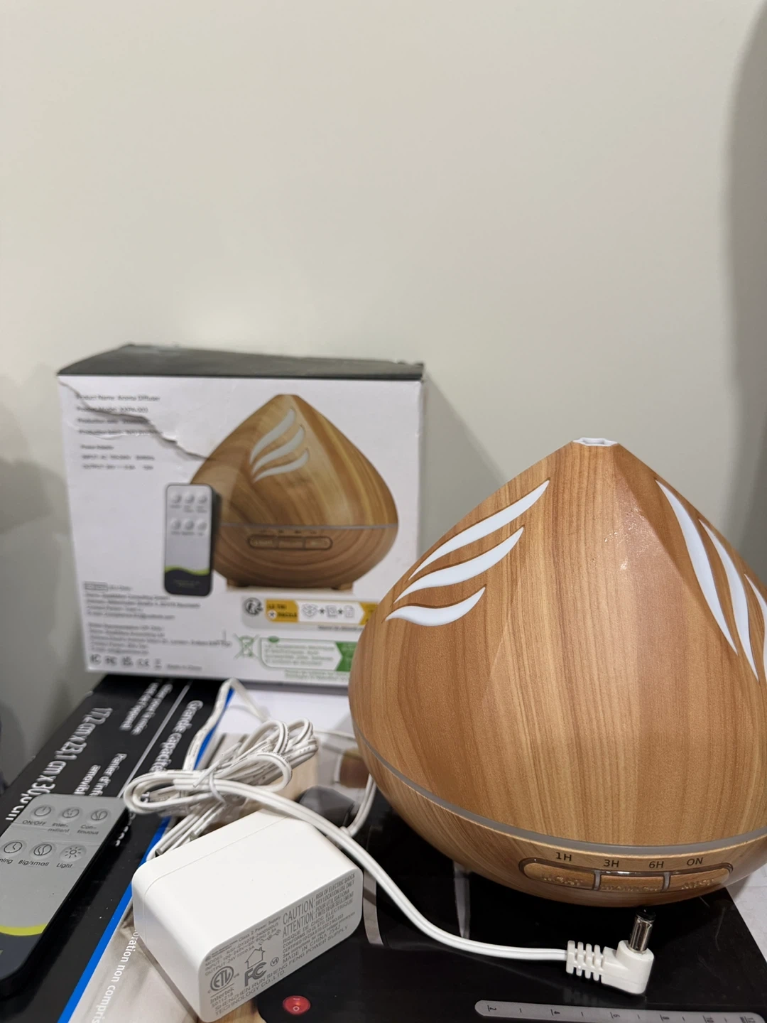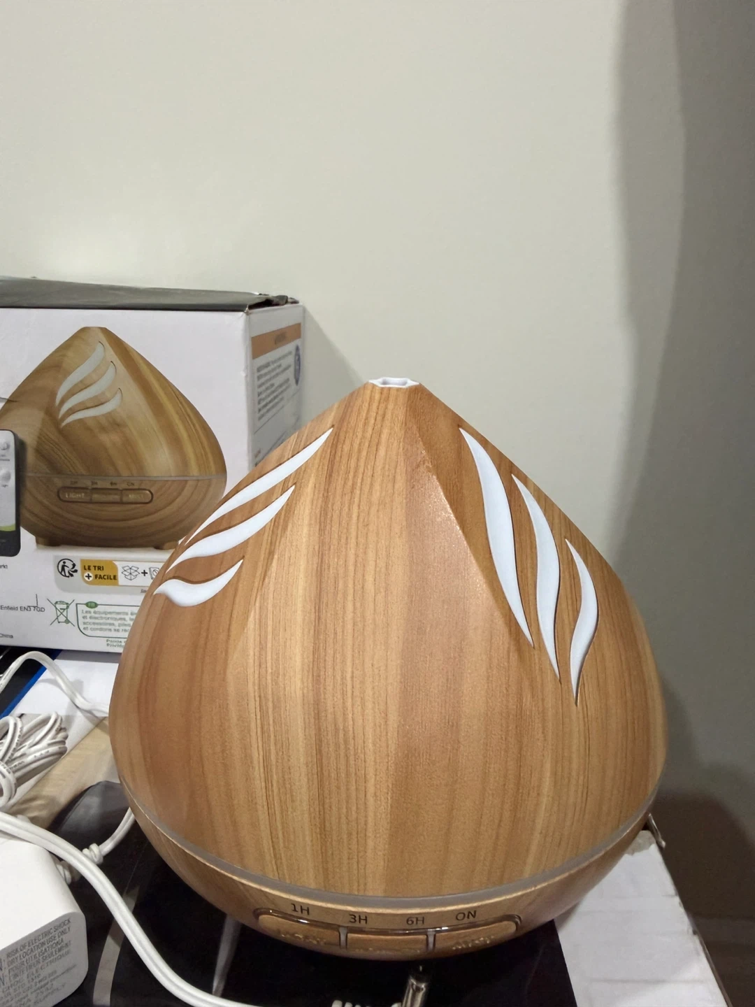 This aroma diffuser has a wood grain finish and includes a remote control for easy operation. It offers timer settings of 1H, 3H, and 6H, and has an 'ON' setting. It's designed to create a pleasant atmosphere in any room.