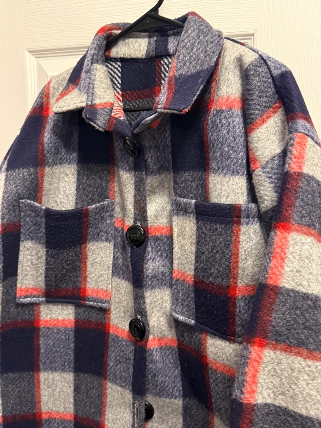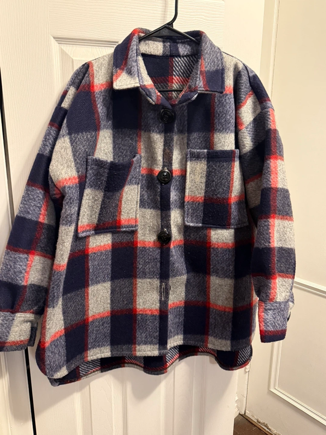 Cozy flannel shacket in a classic plaid pattern! It's perfect for layering or wearing on its own during those chilly days. The material is soft and comfortable, making it a great addition to your wardrobe