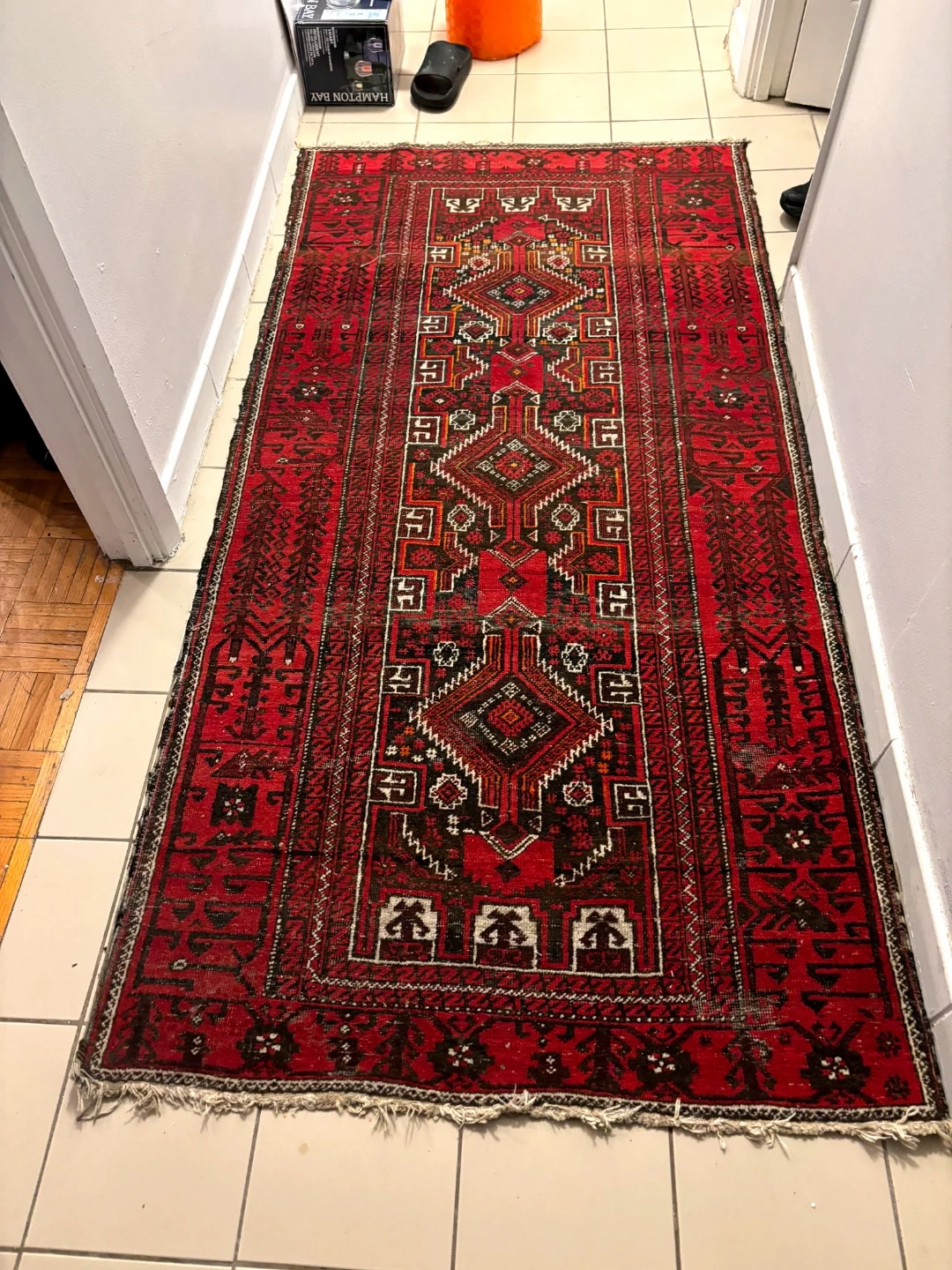 This is a vintage Persian runner carpet with intricate traditional patterns. It features a vibrant red base with detailed geometric designs in black, white, and orange. The rug is made of durable material, suitable for hallways or entryways. It's a beautiful accent piece for any home!