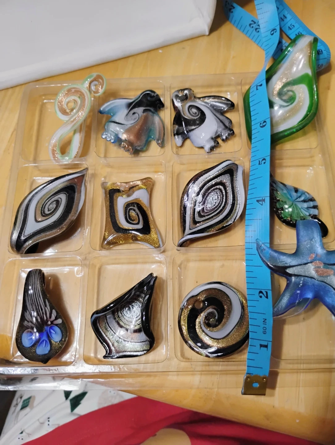 This set includes twelve assorted glass pendants, each with unique swirled designs and metallic accents. They're perfect for jewellery making or crafting. The largest pendant measures approximately 2.5 inches.