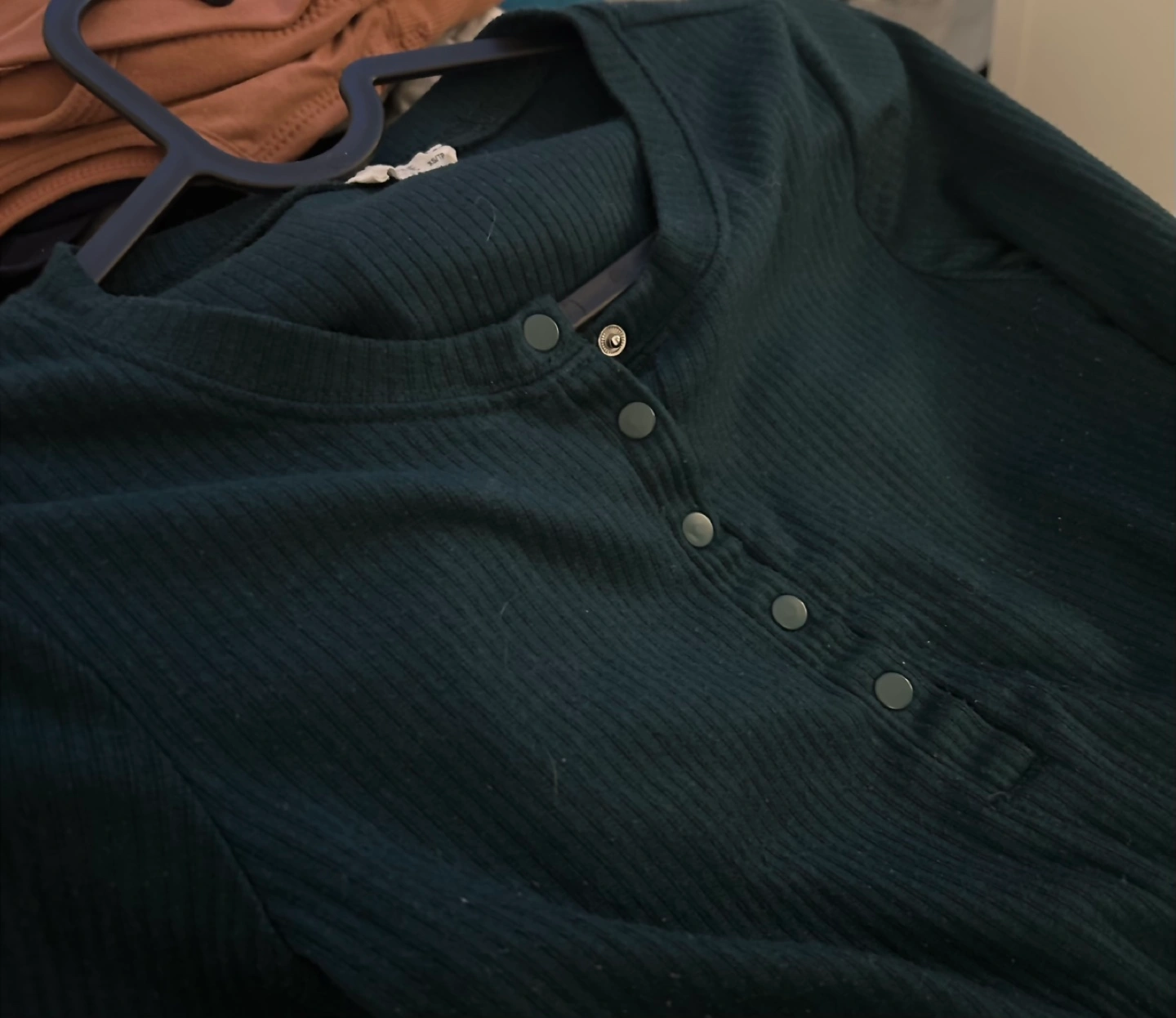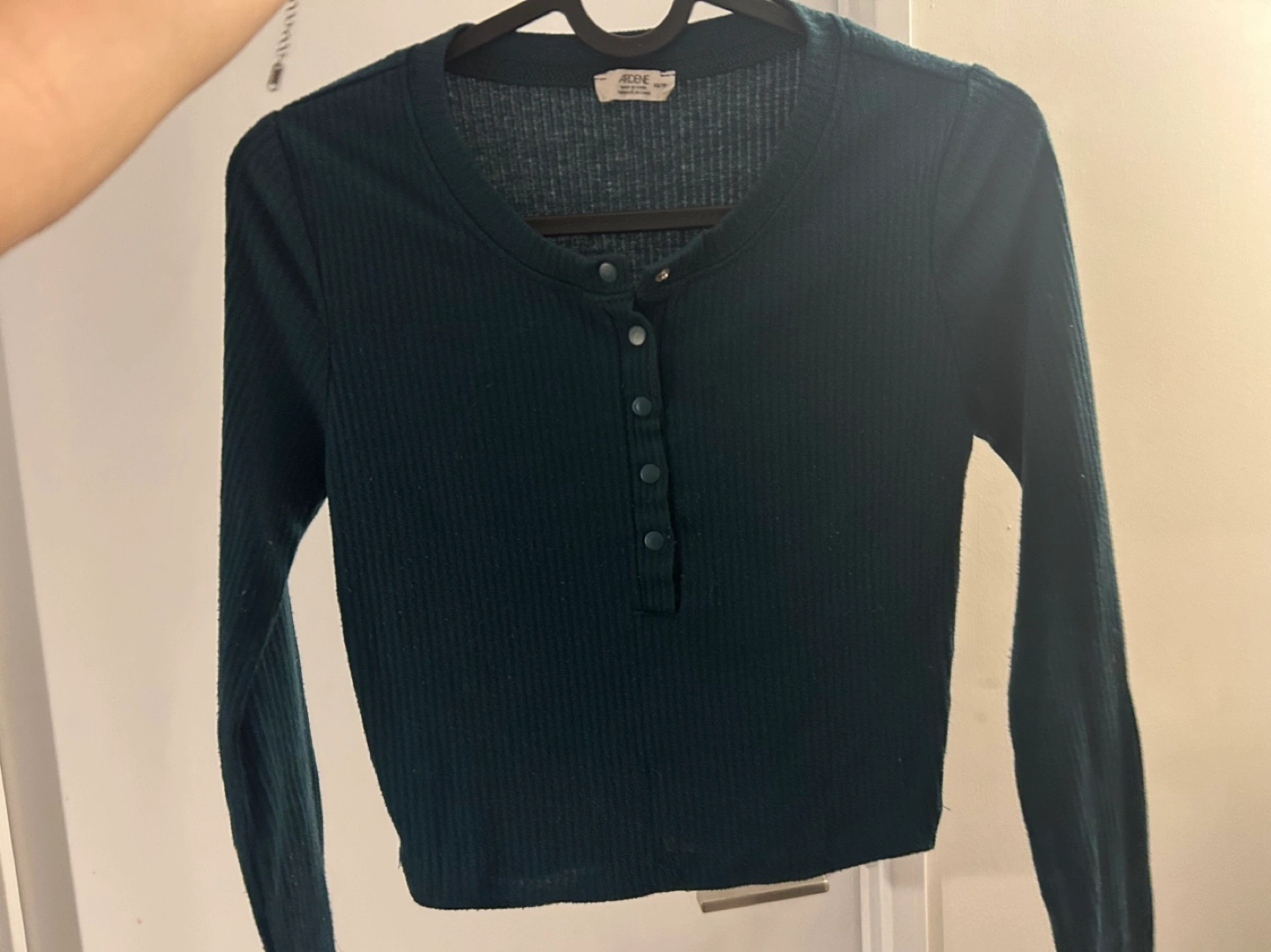 Dark green top. Long sleeves. Button placket. Can look ribbed/cropped depending on your body type. It’s not as big/baggy as it looks in the picture (tight fit).