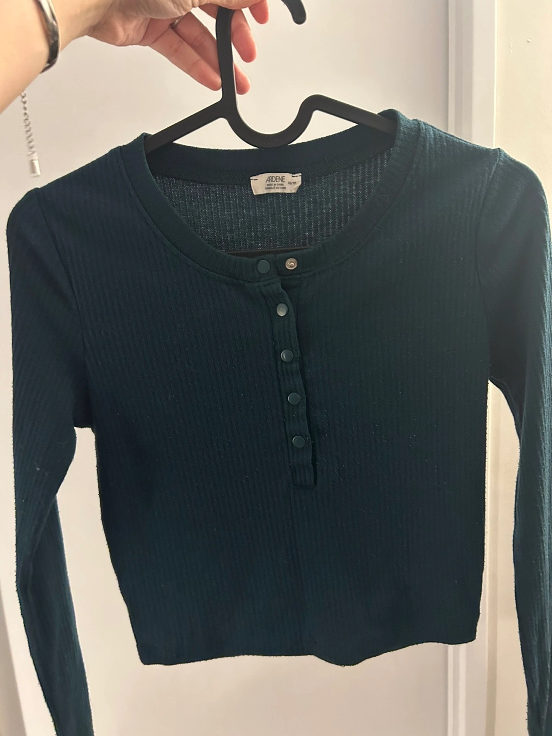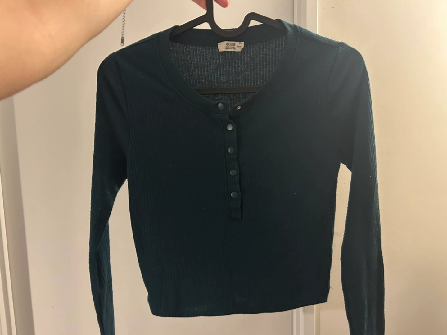 Dark green top. Long sleeves. Button placket. Can look ribbed/cropped depending on your body type. It’s not as big/baggy as it looks in the picture (tight fit).