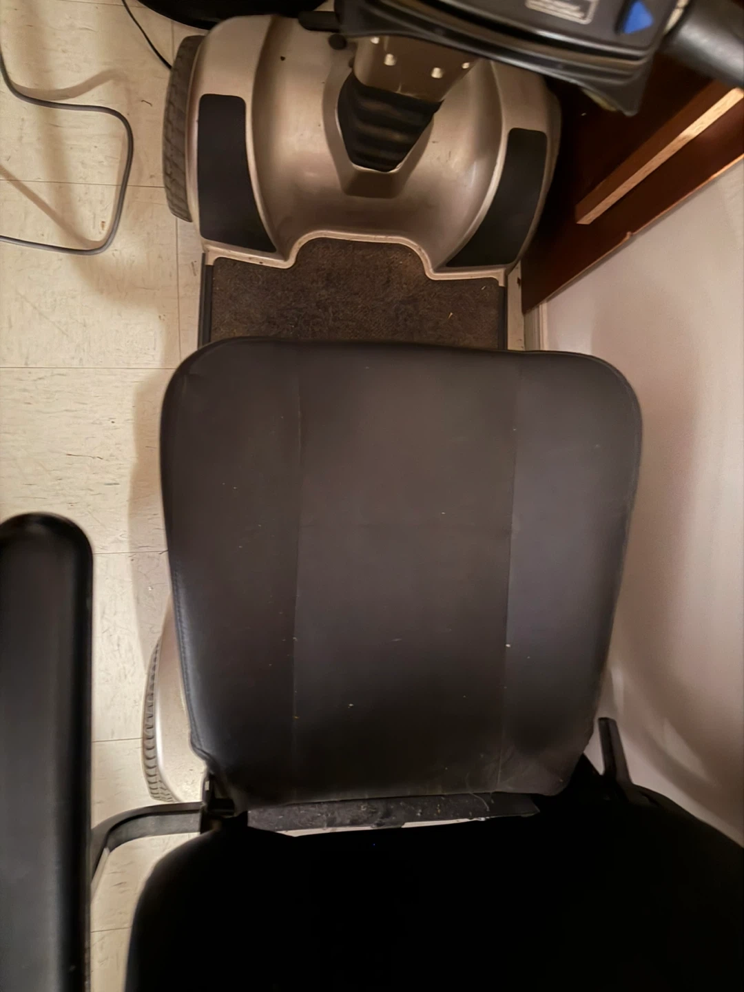 Pride Mobility Legend mobility scooter with a comfortable padded seat. It's silver and black. This scooter is suitable for getting around town or for individuals who need assistance with mobility.