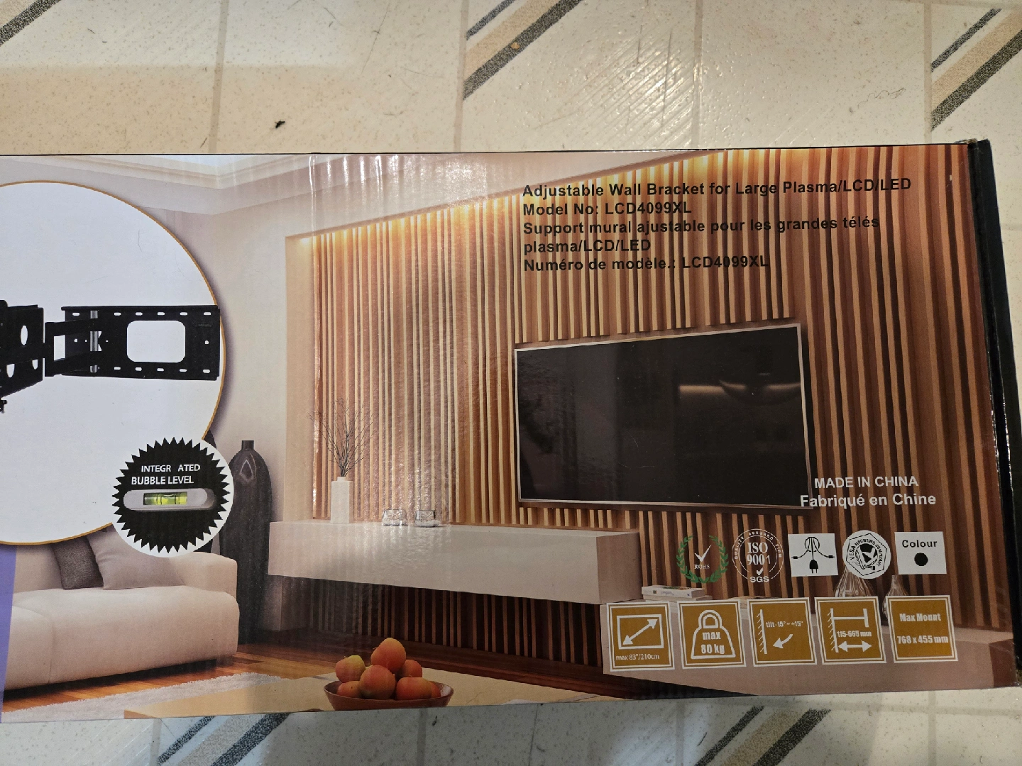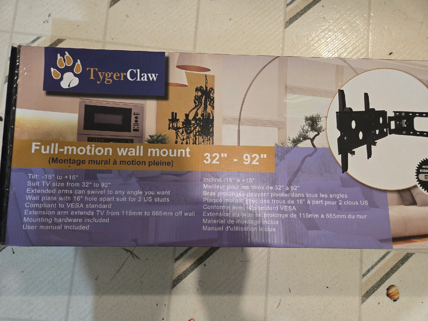 Selling a TygerClaw full-motion wall mount, suitable for TVs from 32" to 92". The extended arms can swivel to any angle you want. The wall plate with 16" hole apart is suitable for 2 US studs. The extension arm extends TV from 115mm to 665mm off the wall. Mounting hardware and user manual are included