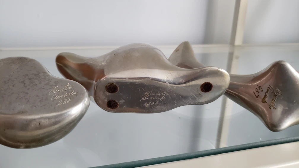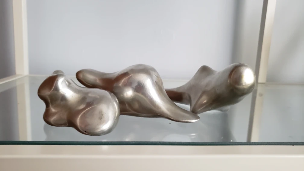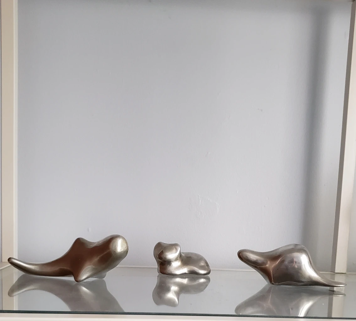 Three abstract aluminum sculptures. They are in the shape of an animal.