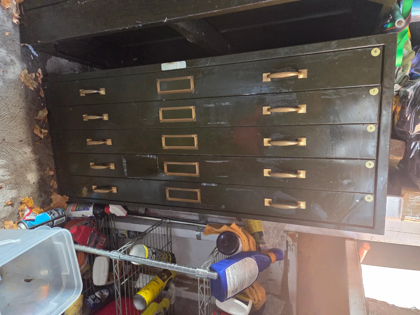 A vintage 5-drawer flat file cabinet with brass handles. This cabinet is dark green and perfect for storing blueprints, artwork, or other large documents. It's great for an artist's studio or workshop!