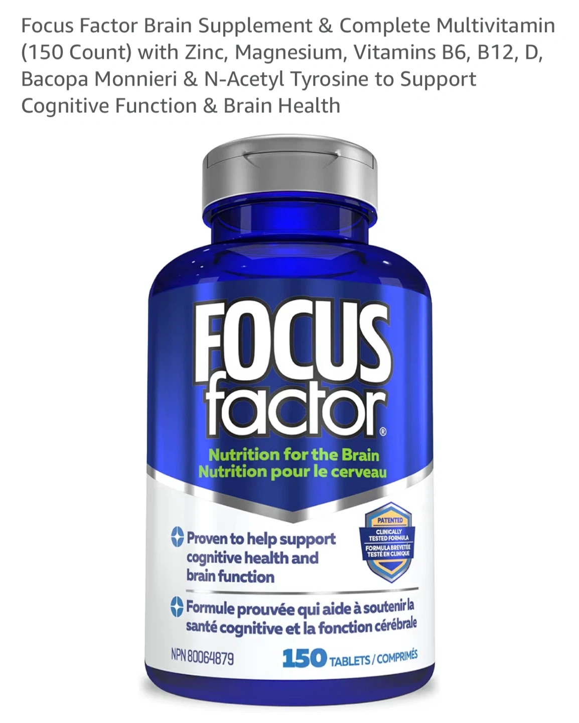 Focus Factor Nutrition for the Brain, 150 tablets per bottle. Proven to help support cognitive health and brain function. Expiry date is September 2027.