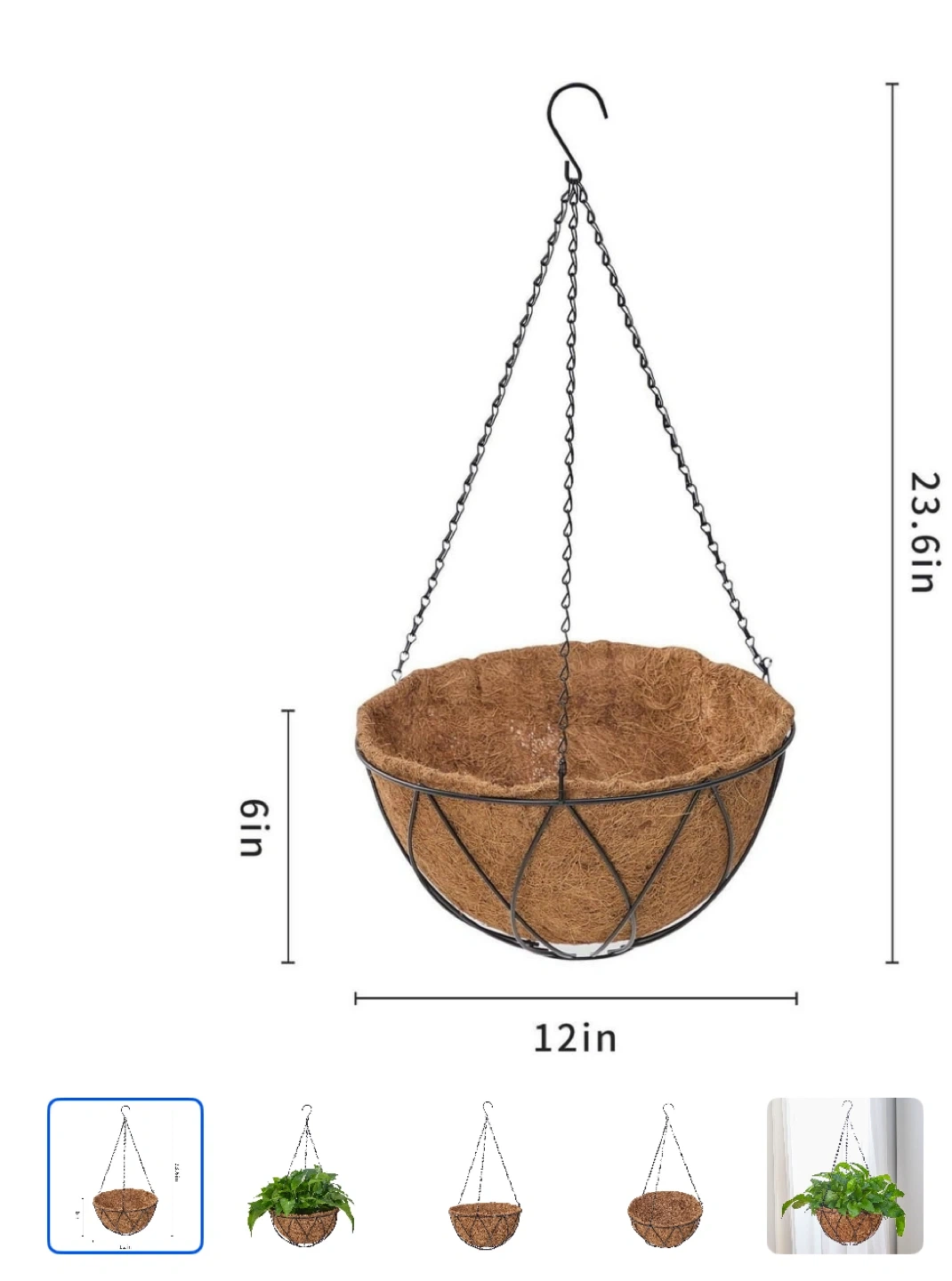 This hanging planter basket is perfect for adding some greenery to your space! It measures 12 inches in diameter and 6 inches in height, with a total hanging height of 23.6 inches. The basket is made with a coconut liner, making it ideal for growing plants