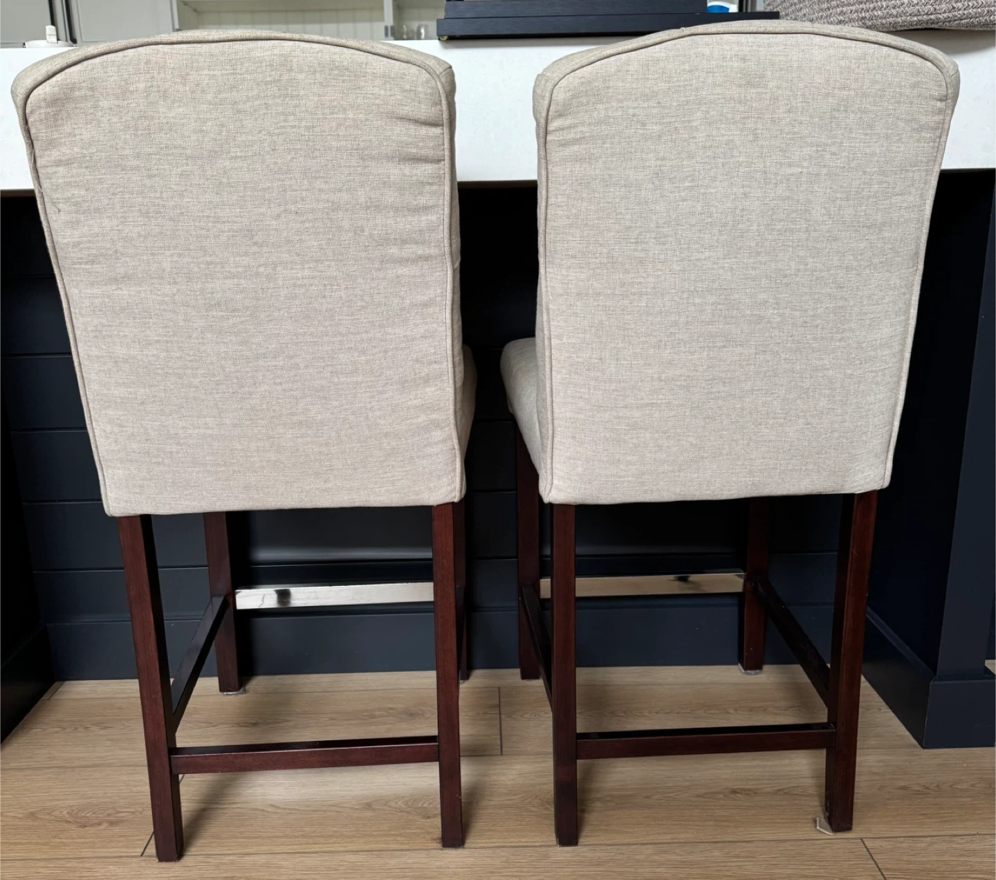 A set of two upholstered bar stools with tufted backs. Linen-look fabric in a neutral beige. Dark wood legs. Includes metal footrest.