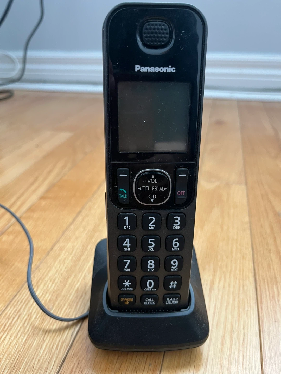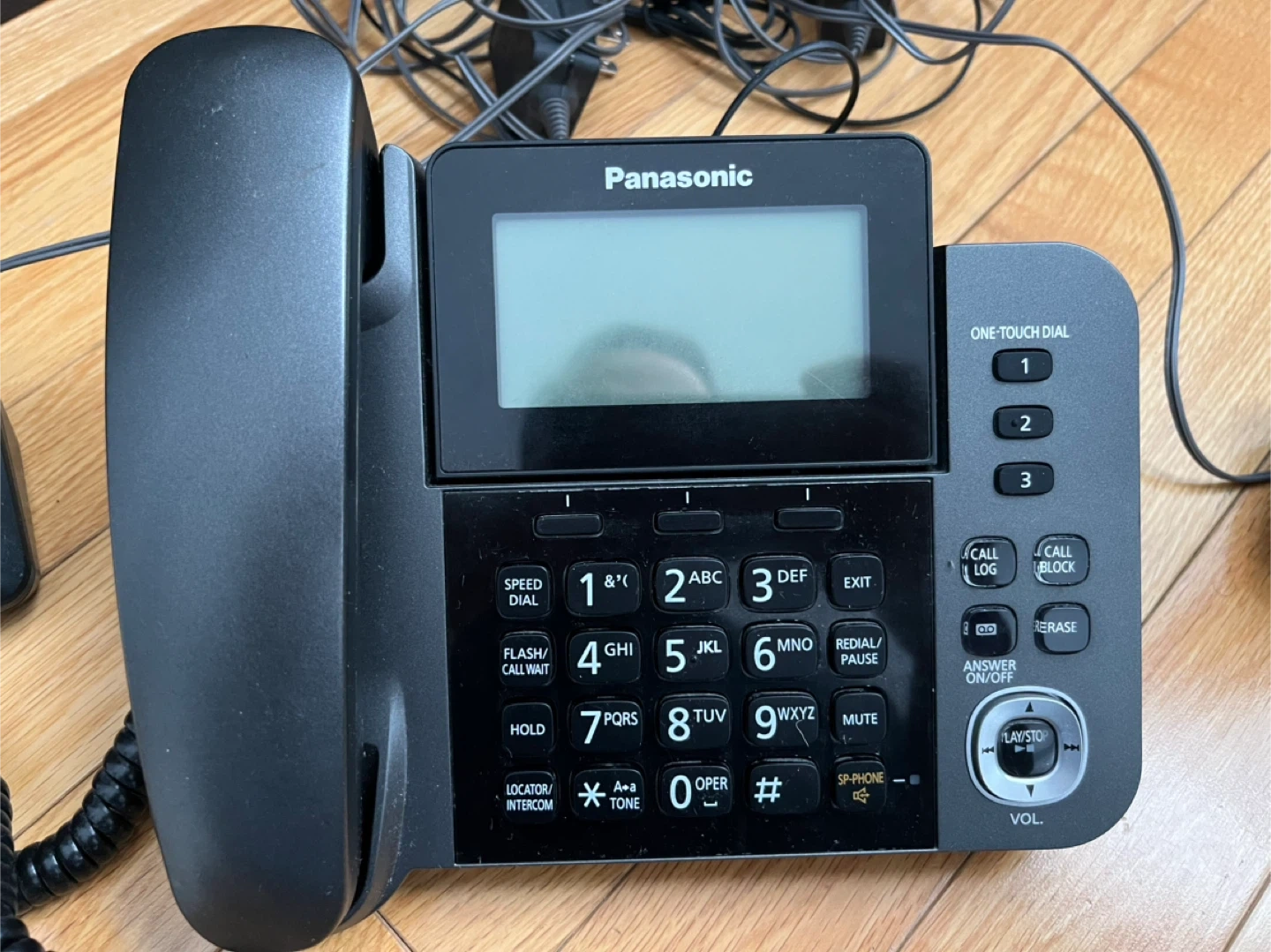 Panasonic 2-in-1 Corded/Cordless Phone with Answering Machine, Advanced Call Log/Block, and Talking Caller ID - 2 Cordless Handset - (Black) This is a Panasonic cordless phone system with two handsets. It features a main base unit and two charging cradles. The system is black and comes with its cords.