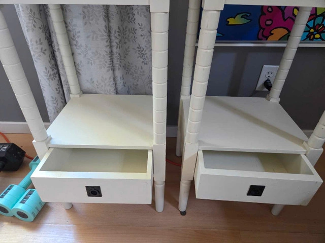 These white end tables are perfect for adding a touch of elegance to any room. Each table features a drawer for convenient storage and a shelf for displaying your favourite items. Note that these are previously loved items and show some signs of wear, which only adds to their charm. * Colour: White * Material: Wood * Features: One drawer and one shelf Looking to spruce up your space without breaking the bank? These end tables are your answer!