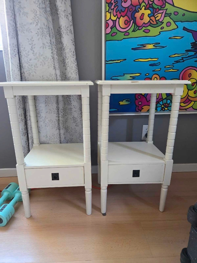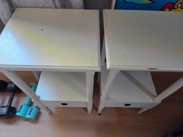 These white end tables are perfect for adding a touch of elegance to any room. Each table features a drawer for convenient storage and a shelf for displaying your favourite items. Note that these are previously loved items and show some signs of wear, which only adds to their charm. * Colour: White * Material: Wood * Features: One drawer and one shelf Looking to spruce up your space without breaking the bank? These end tables are your answer!