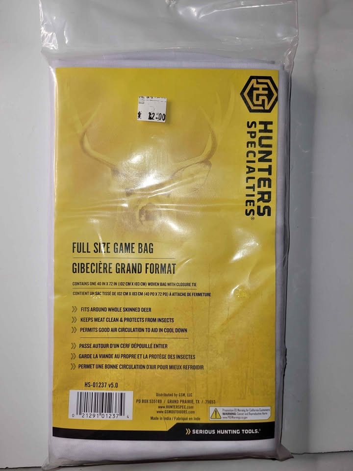 New Hunters Specialties full size game bag. 40 x 72 inches. Woven bag with closure tie. Good for whole skinned deer. Keeps meat clean, protects from insects, and helps with air circulation for cool down.