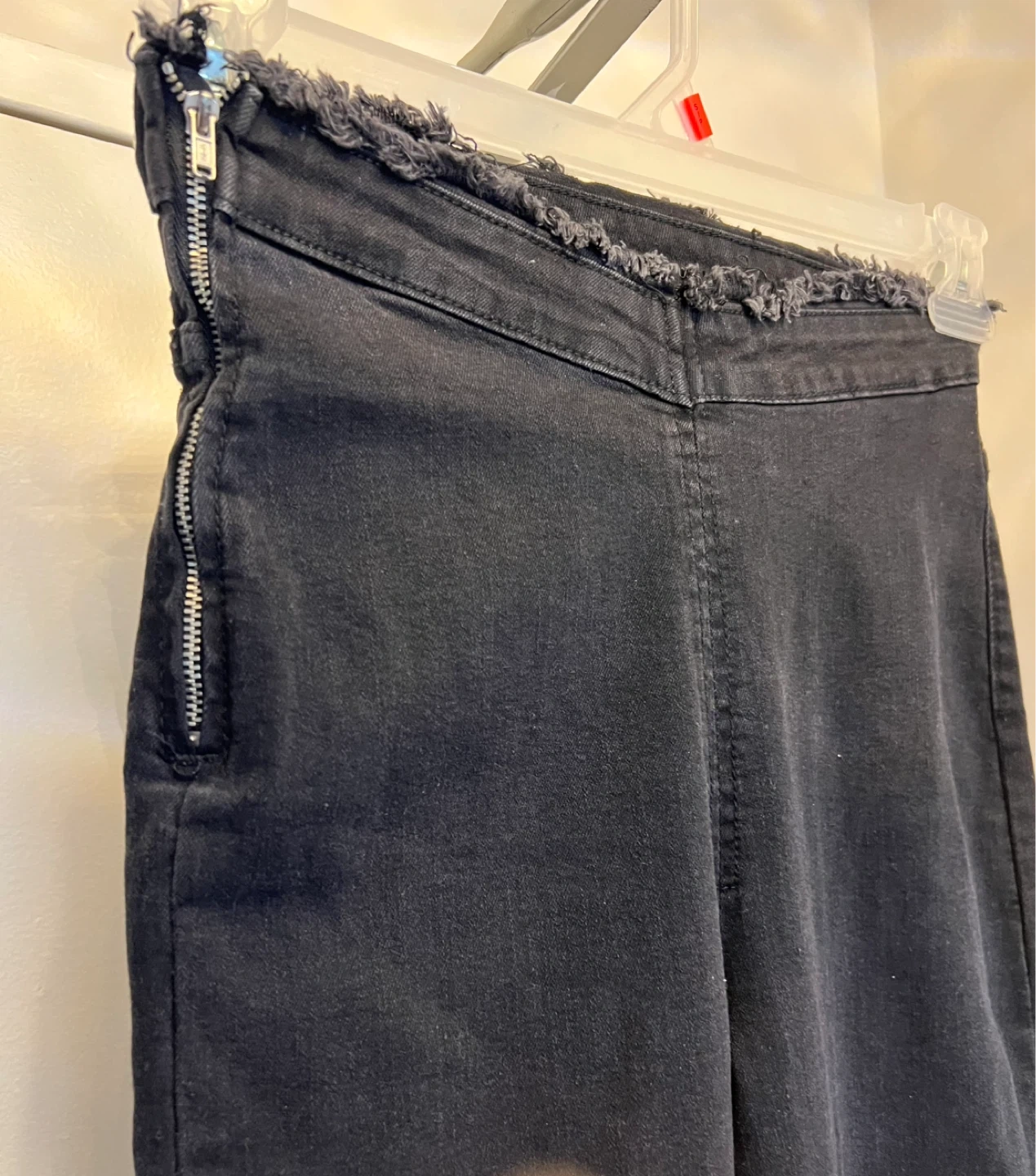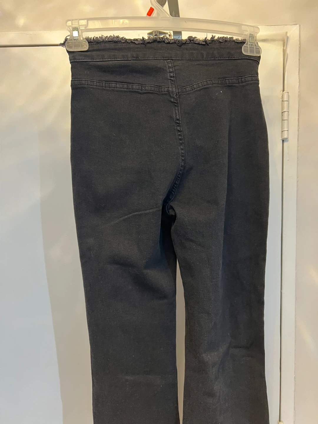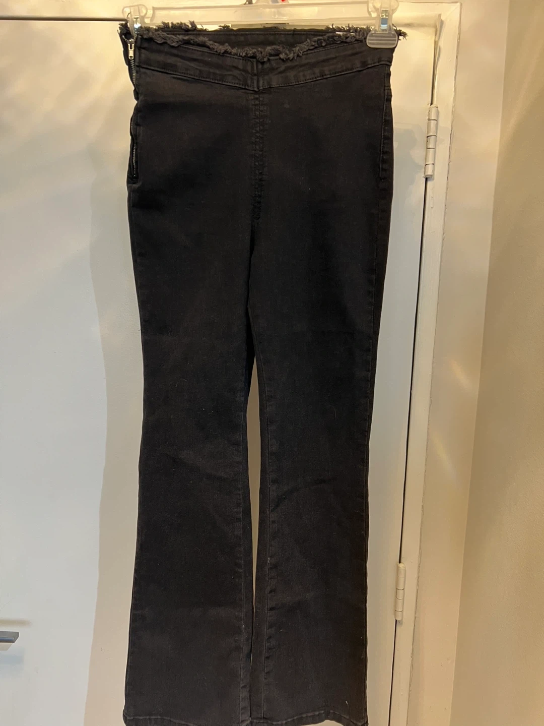 These are black high-waisted flare jeans with a frayed hem and a side zipper. Denim material. Great for casual wear!