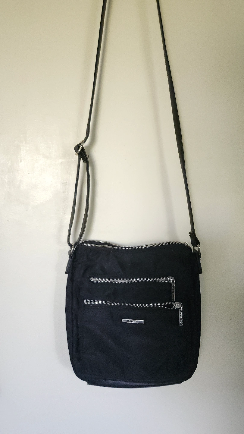Black crossbody purse from Roots w/ multiple zippered compartments. Strap is adjustable. Polyester material wjth fake leather accents. 6 pockets in total. There's some small white flecks but those would probably come out with a wash