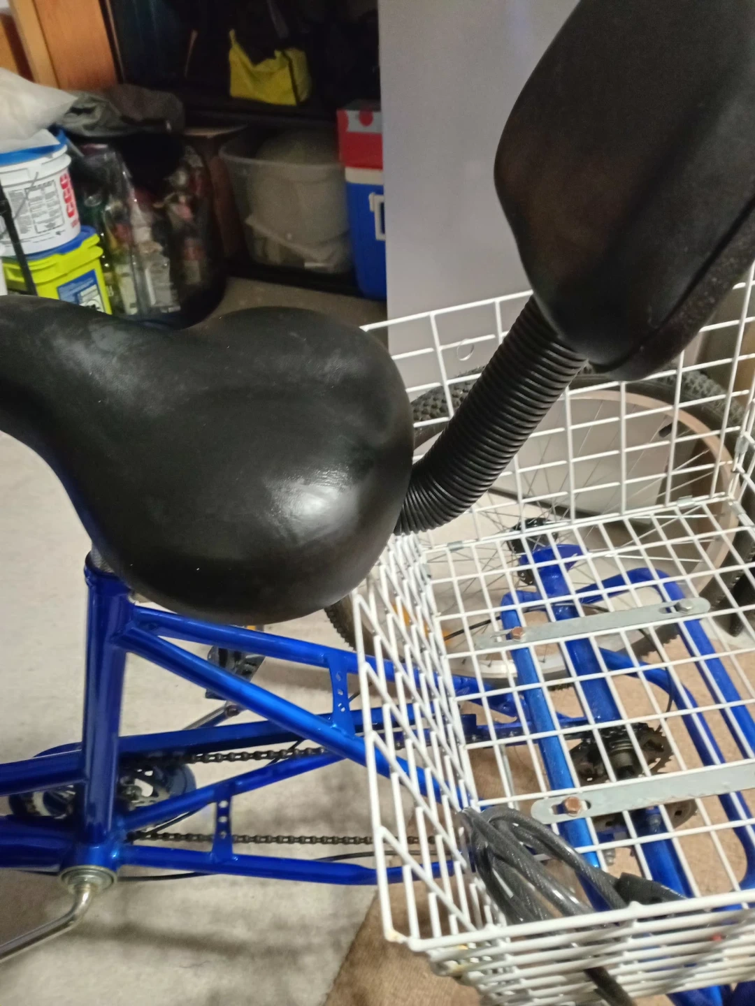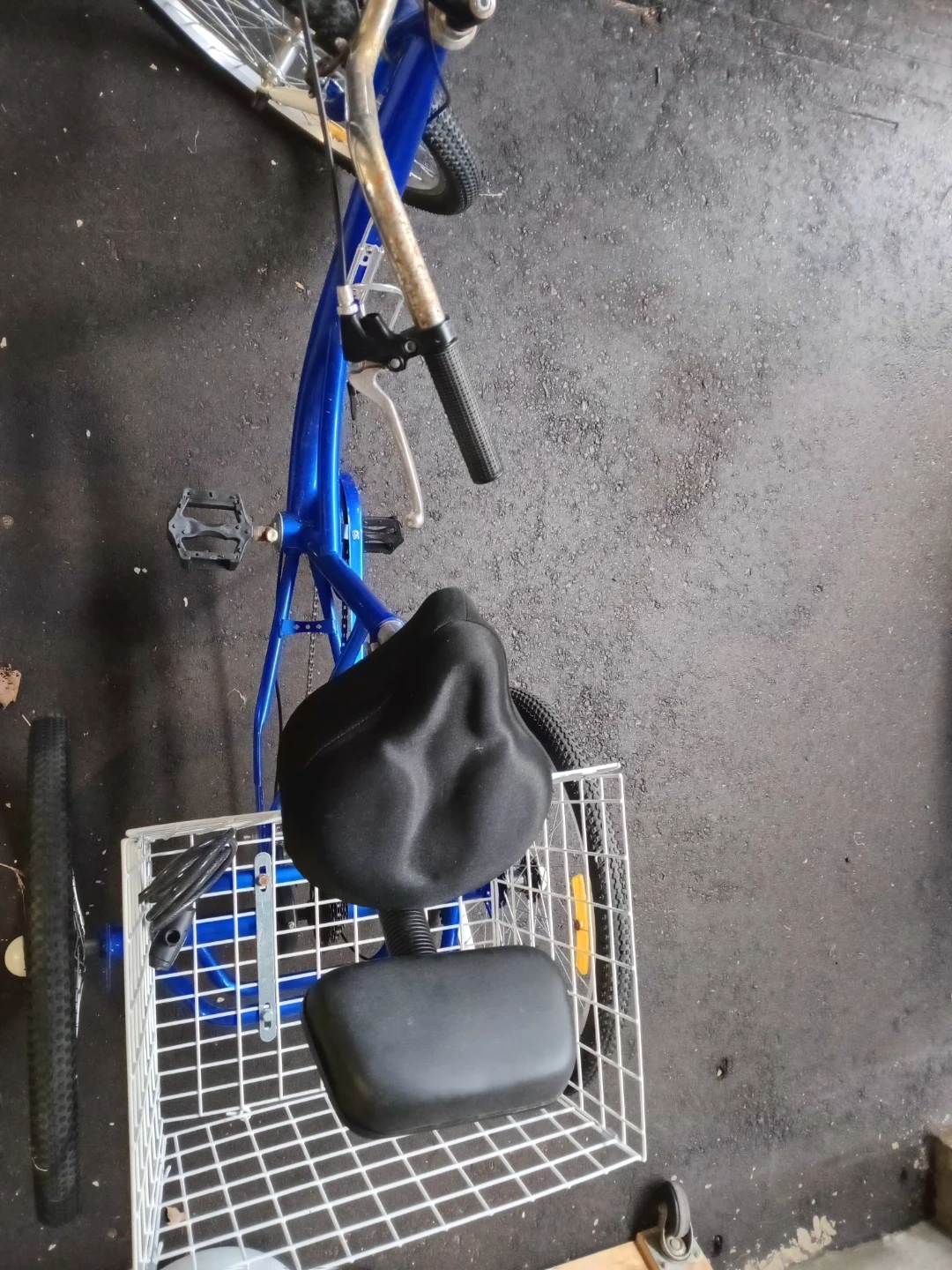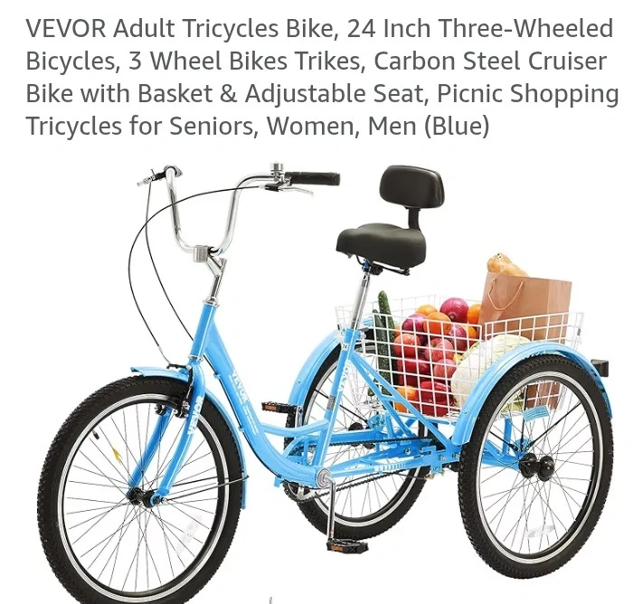This is a VEVOR adult tricycle in blue with 24-inch wheels and a large basket. It features an adjustable seat for comfort. It's suitable for seniors or anyone needing a stable ride for shopping or leisure.