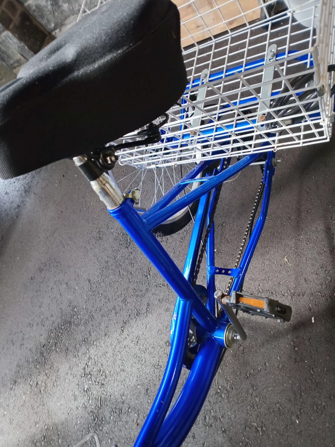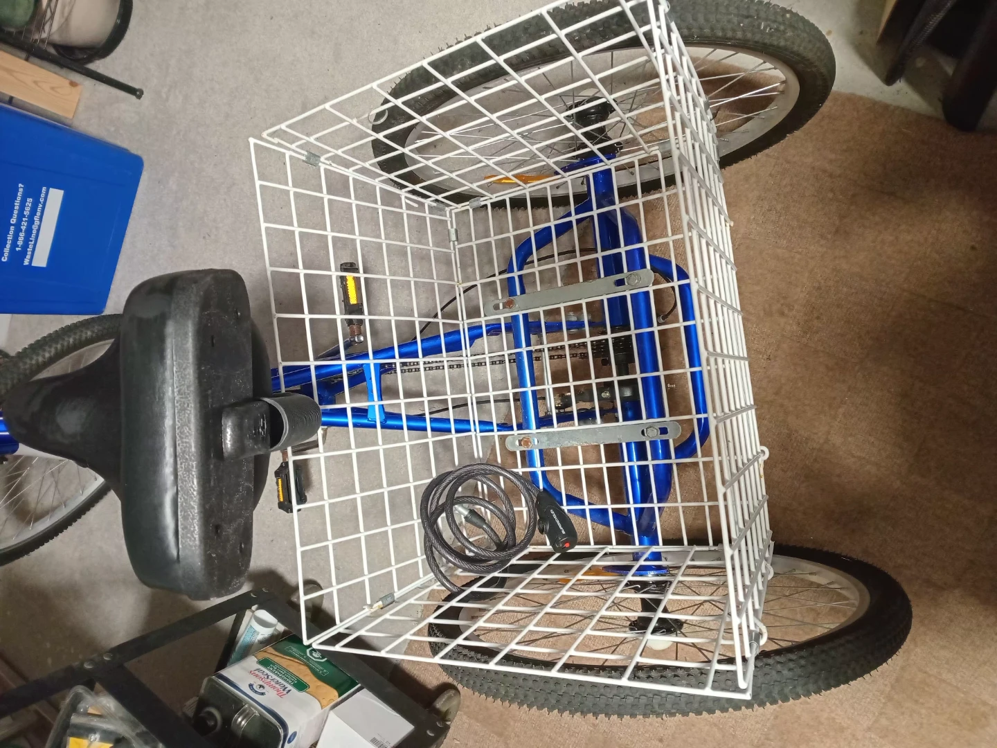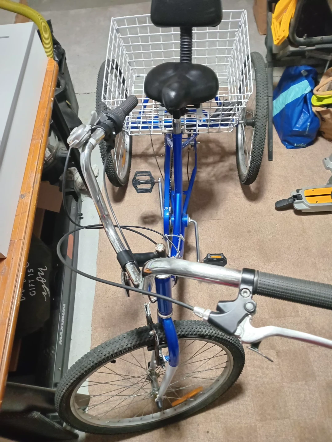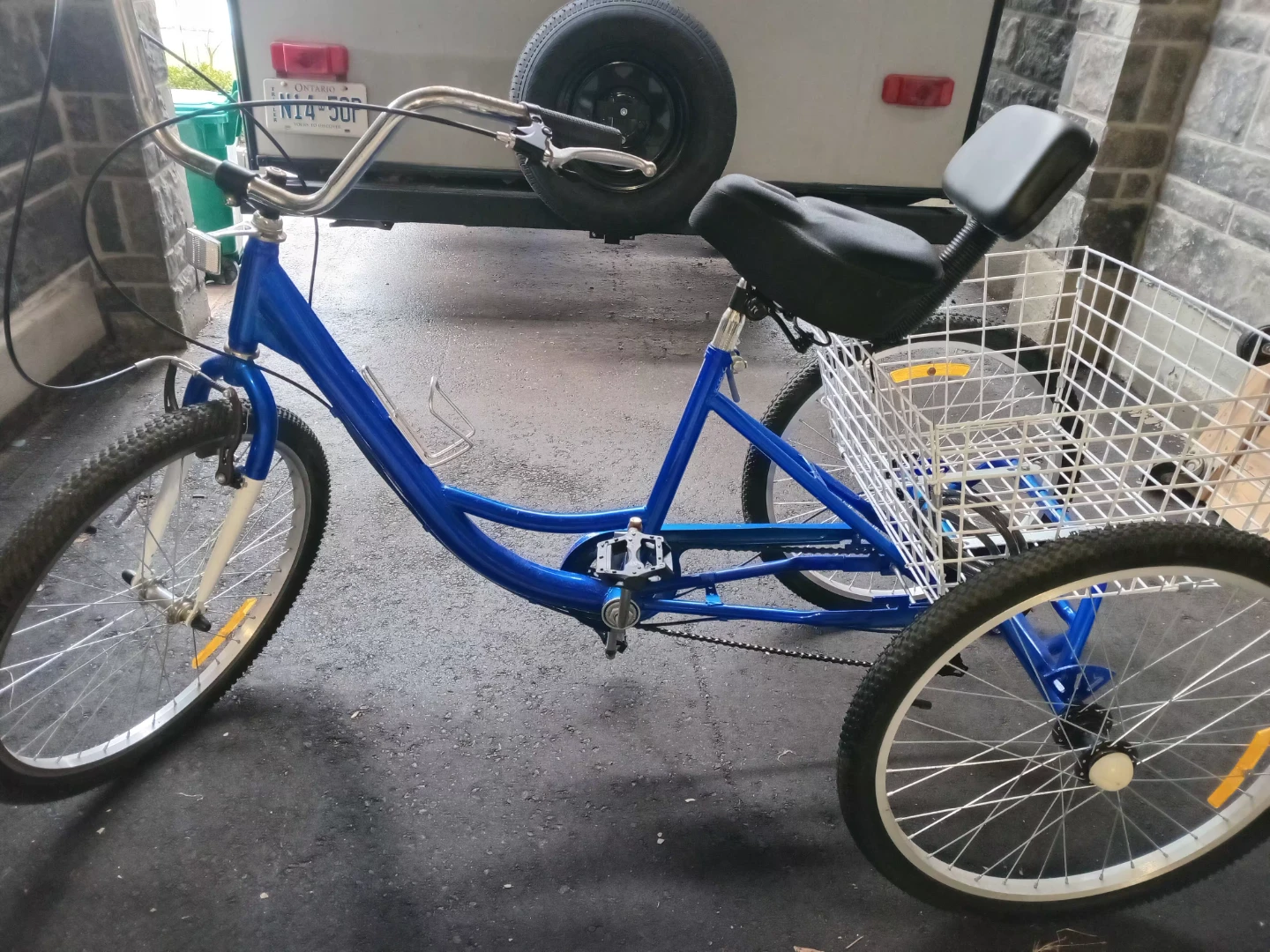 This is a VEVOR adult tricycle in blue with 24-inch wheels and a large basket. It features an adjustable seat for comfort. It's suitable for seniors or anyone needing a stable ride for shopping or leisure.