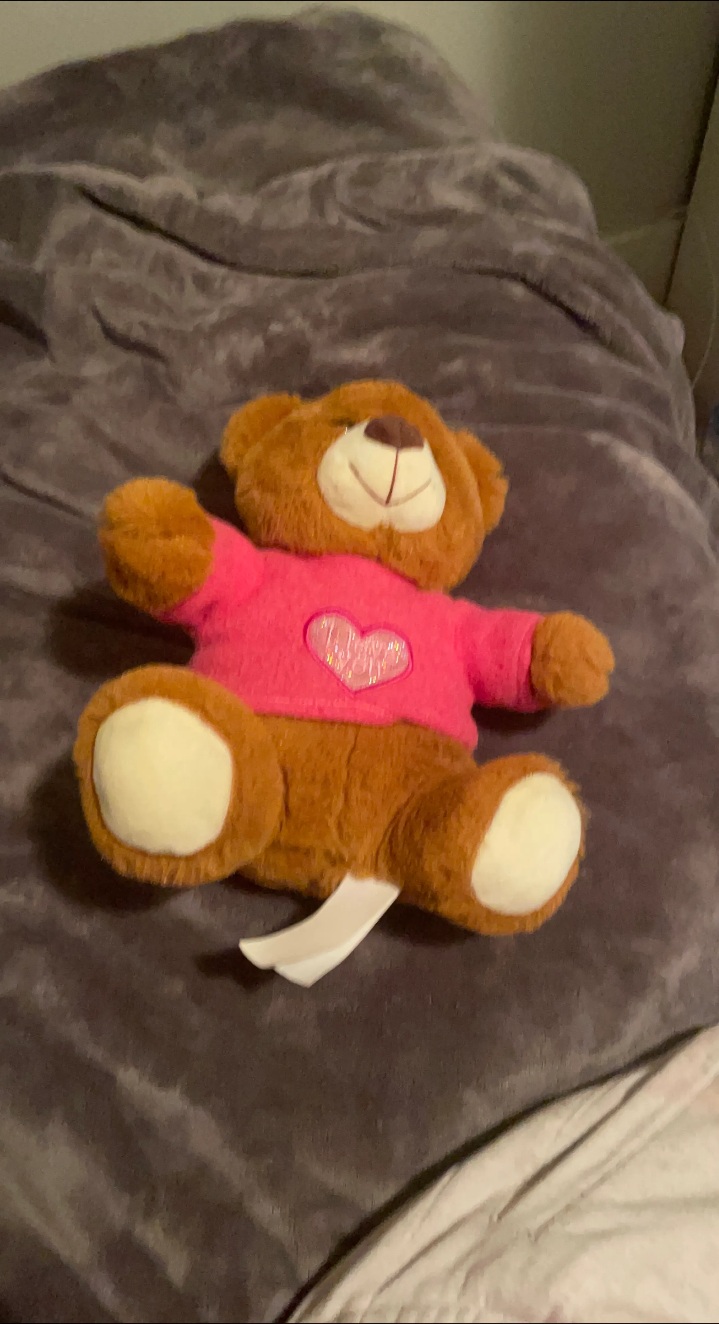 A cuddly brown teddy bear wearing a cute pink shirt with a heart on it! It's in great condition and ready for a new home