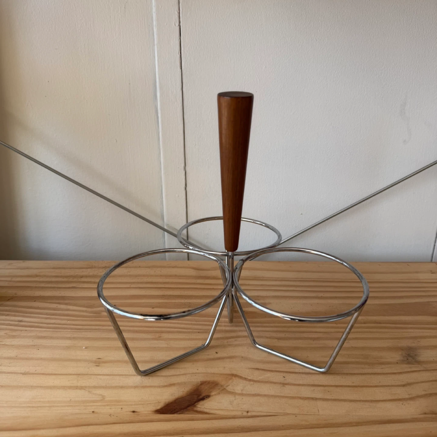 This is a chrome caddy with a wooden handle. It's designed to hold multiple small plant pots,containers or condiments .